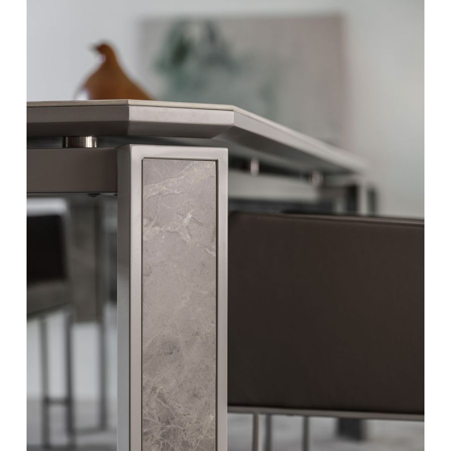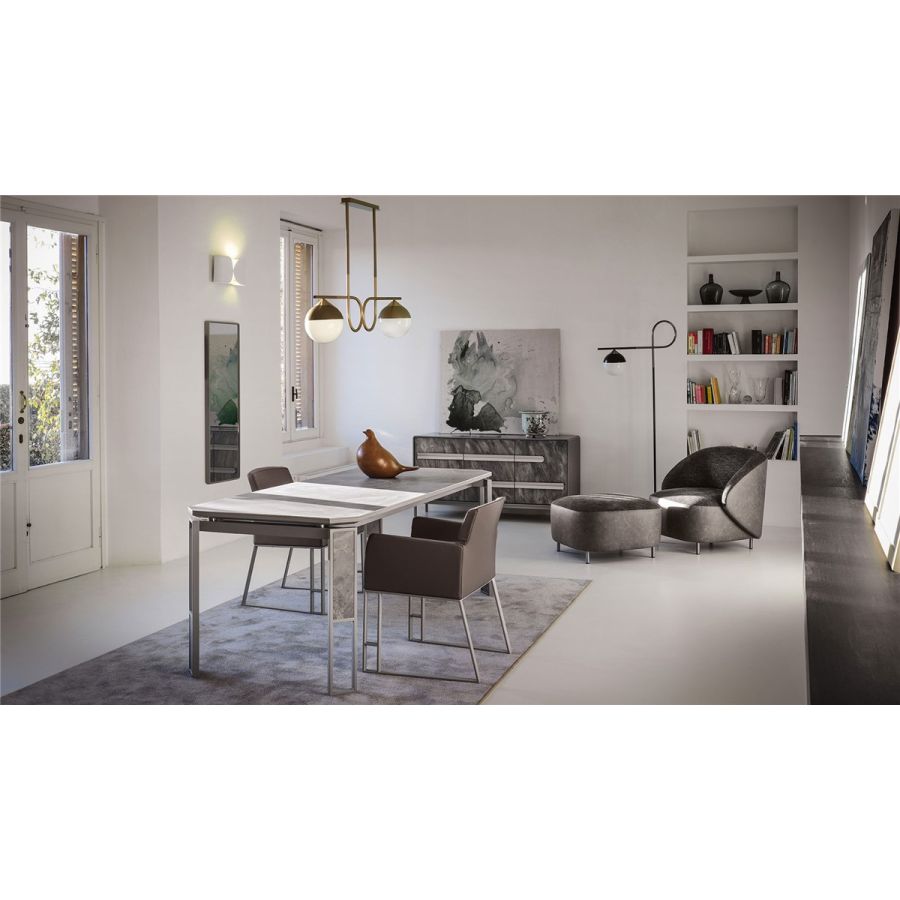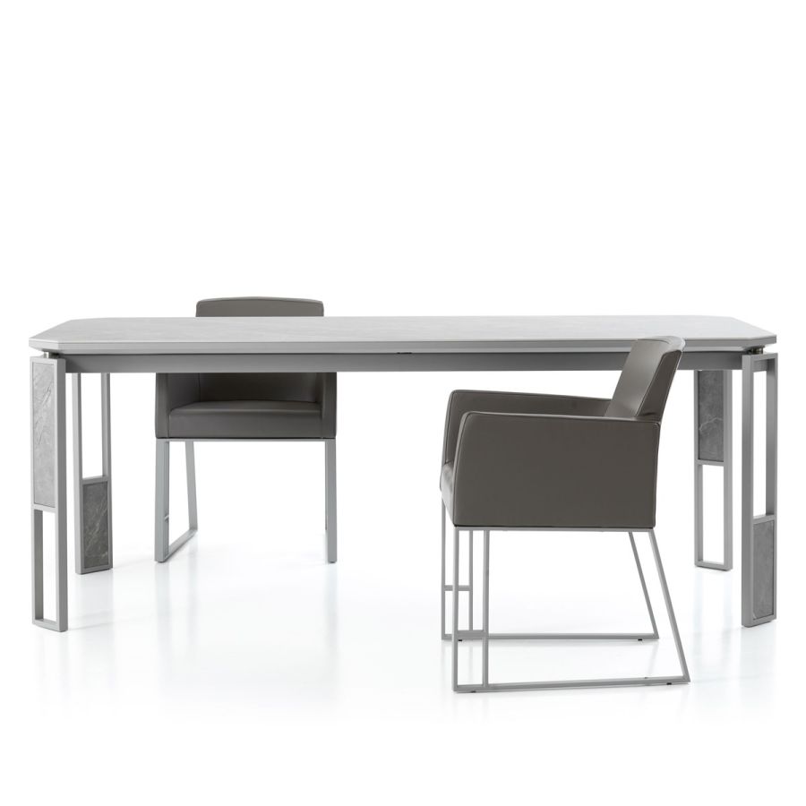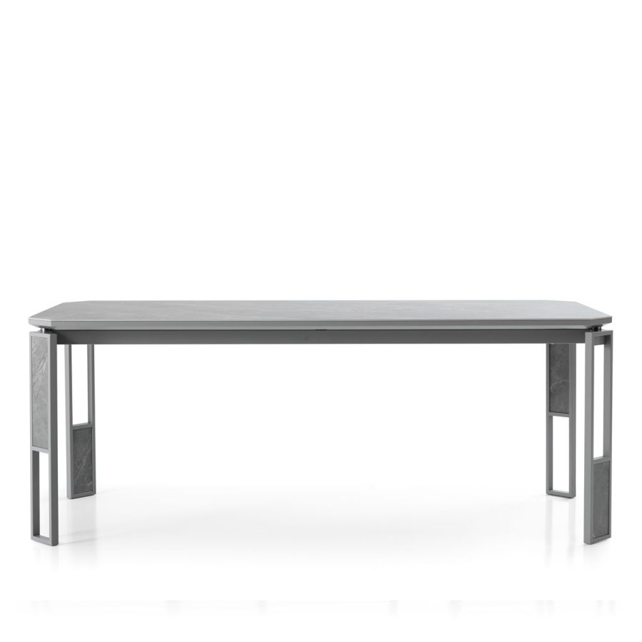 Dining table with rigorous design and pure form. Made from a metal frame embellished with elements set in ceramic stoneware. Available with top in glass, wood or ceramic stoneware.
