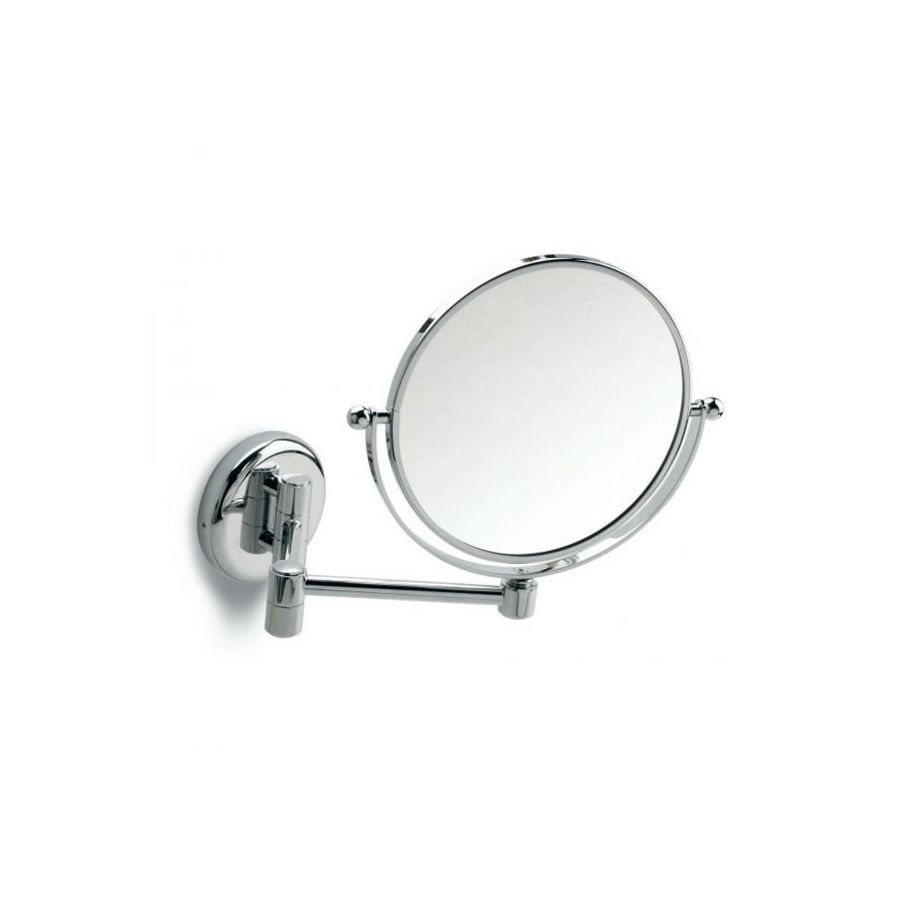 Magnifying mirror with base and articulated arm. Round mirror with double-sided chromed brass frame.