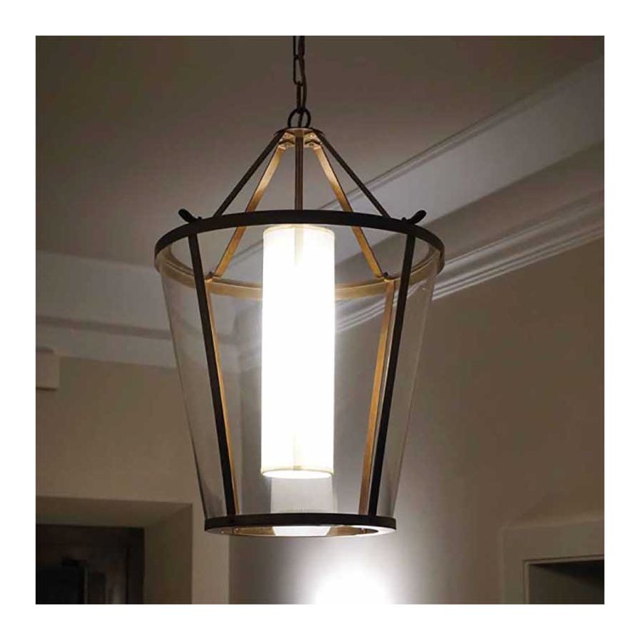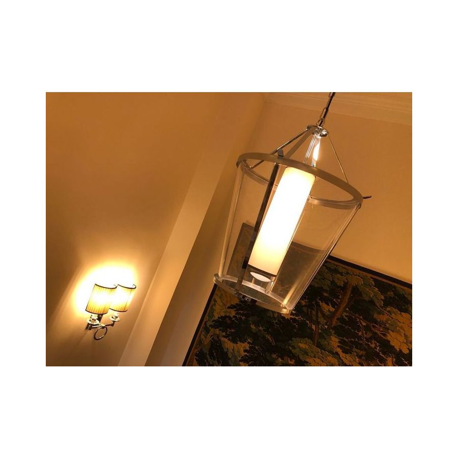 Suspended lantern with brass and transparent plexiglass structure complete with fabric lampshade.