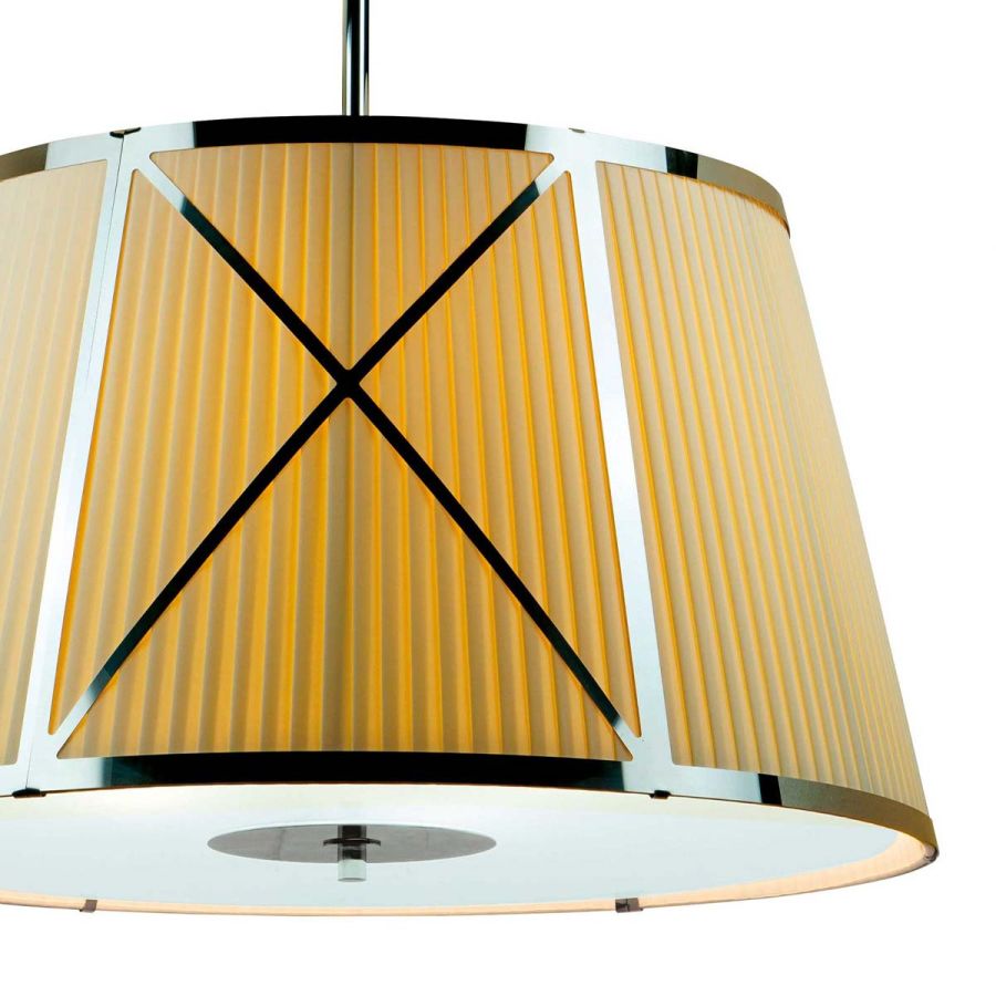 Suspension in ivory plisse'fasciato fabric and polished stainless steel metal structure. Stem and details in chrome finish brass. Satin-finish glass diffuser.