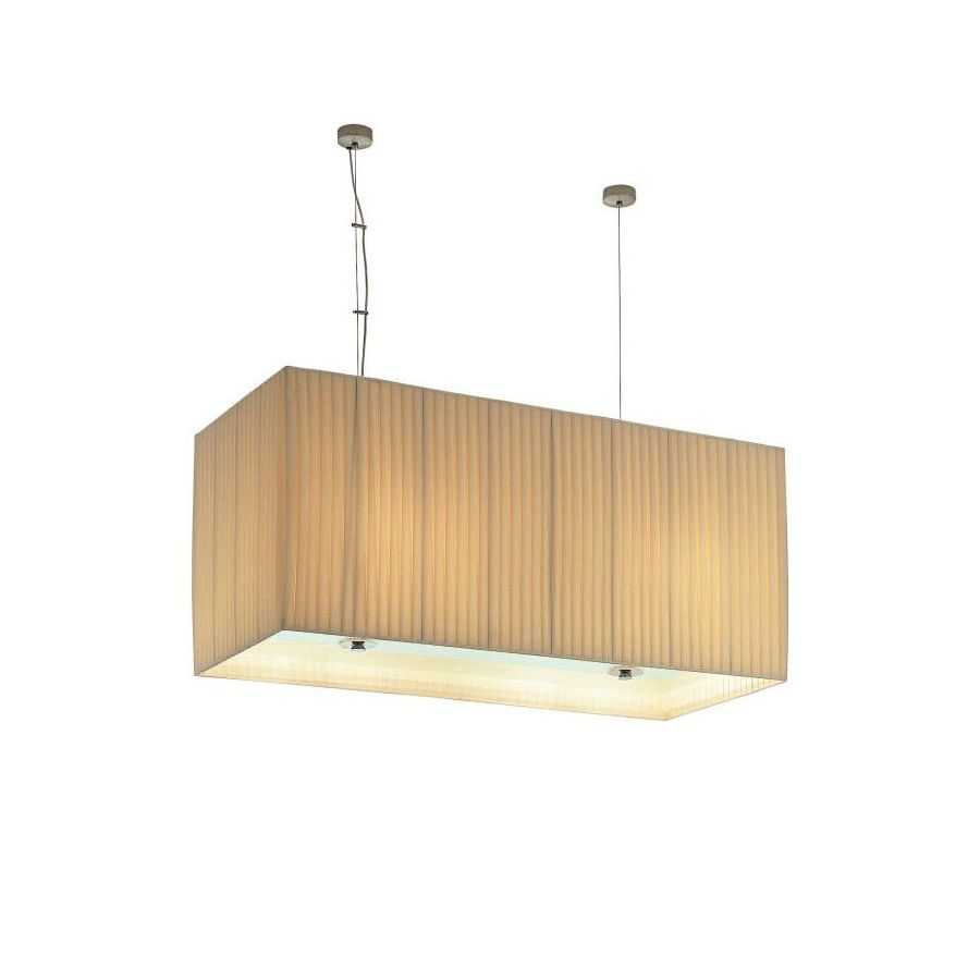 Chandelier with mounting bracket fixting at cieling. Painting metal structure with glass diffuser and fabric lampshade.