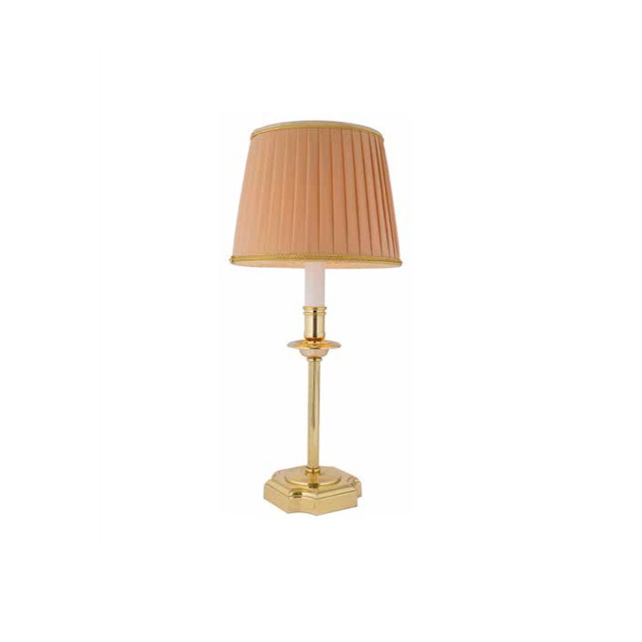 Bedside table lamp in brass with single light. Fabric lampshade.