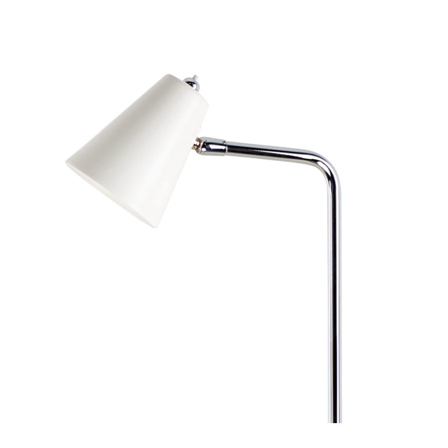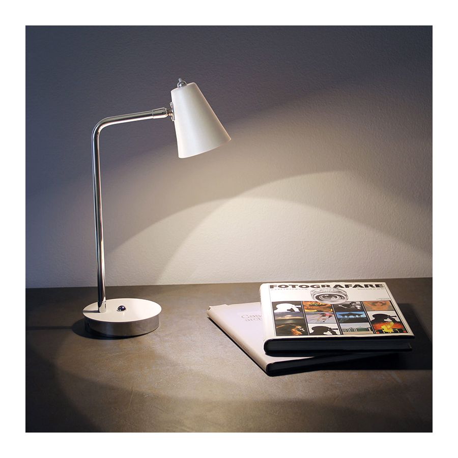 Designed to maximise comfort during work or study sessions, this table lamp features an elegant, minimalist design. Its structure consists of a round base and a stem with a joint at the end that allows you to adjust the lampshade to your liking.
