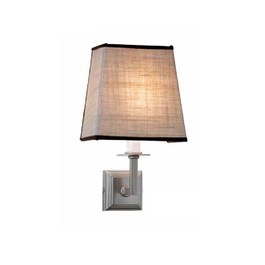 Lamp for wall installation mounting bracket for fixing at wall. Structure in brass with fabric lampshades.