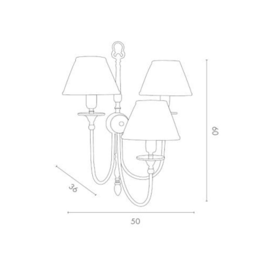 Three-light wall lamp made of antique brass and decorated metal, fabric lampshade.