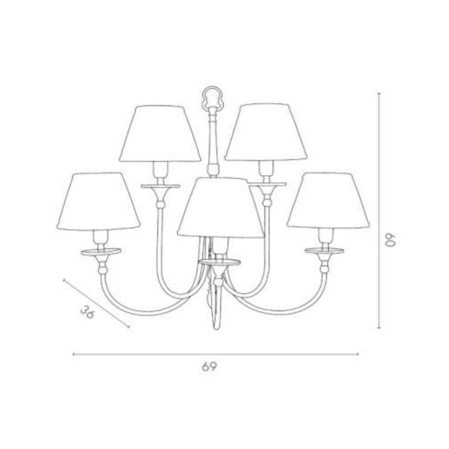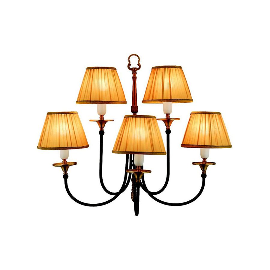 Five-light wall lamp in antique brass and decorated metal, fabric shade.