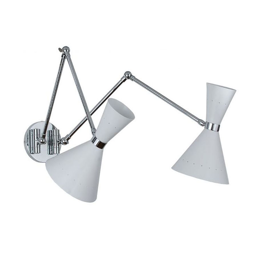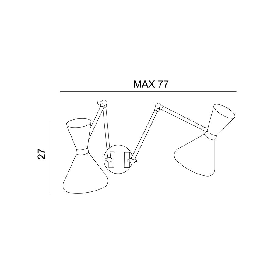 Wall lamp with double adjustable and articulated arm in dark brushed bronzed brass and painted metal parabolic reflectors.