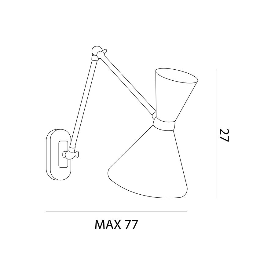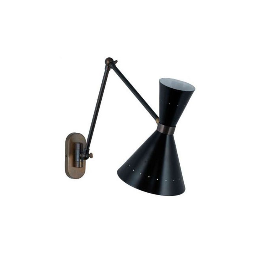 Wall lamp with adjustable and articulated arm in dark brushed bronze-finish brass with painted metal reflectors.