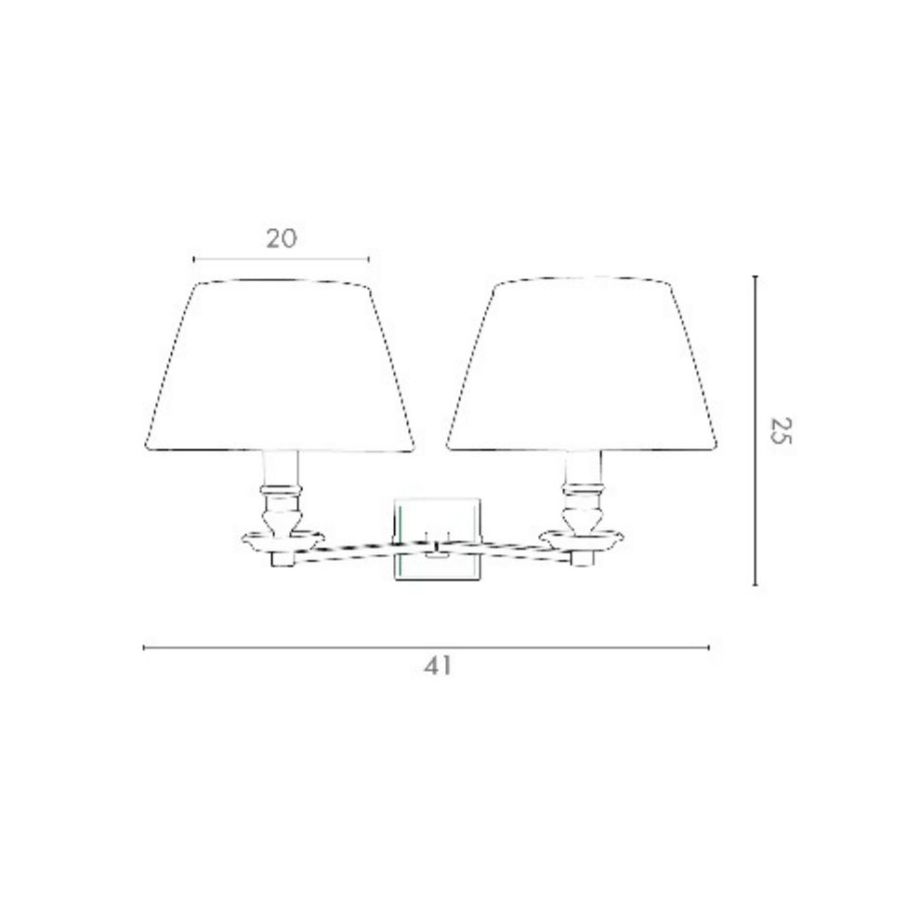 Two-light brass wall lamp, satin nickel finish. Fabric lampshades.