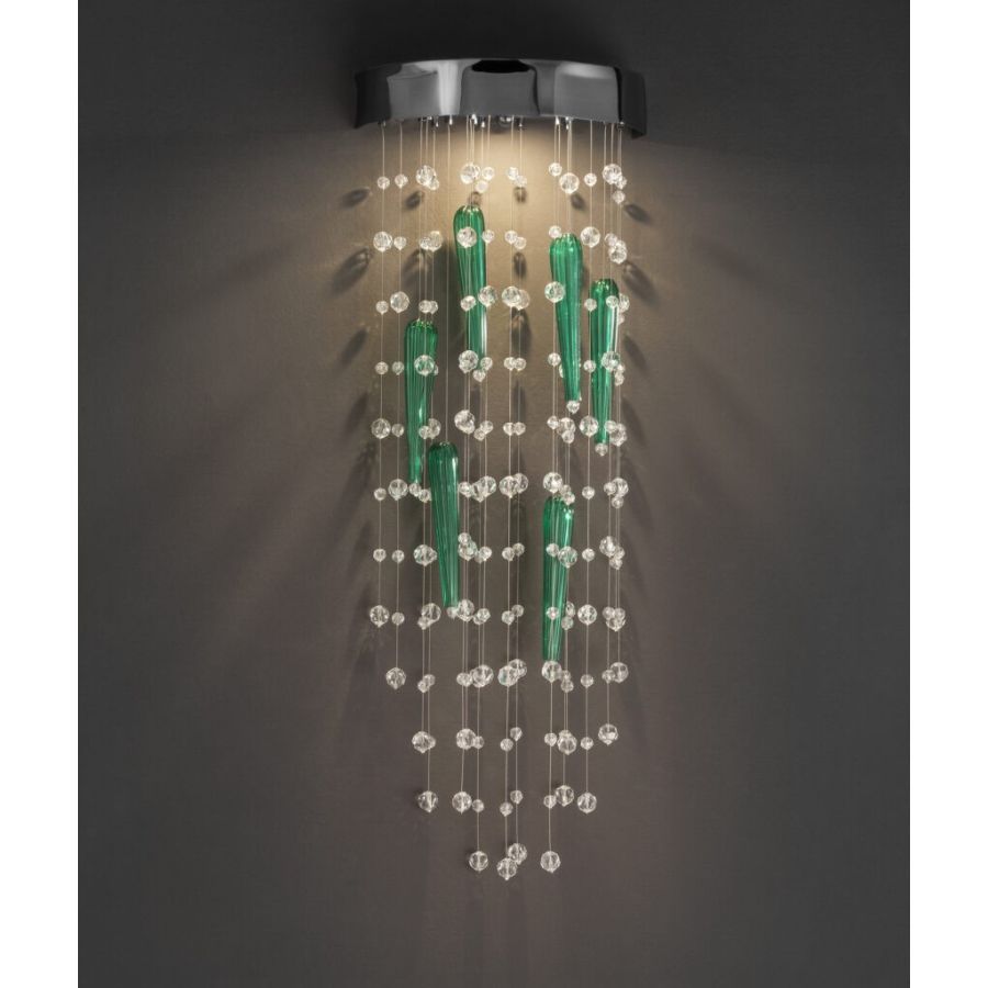 A trail of light that cuts through the sky and illuminates the horizon with a thousand flashes. This is the evocative image that inspired Meteorite, a charming and elegant hanging light. A precious blown glass creation hovers in the centre of the chandelier like a bundle of grass tied by a silver ribbon. An enveloping cascade of crystals descending from above showers everything in splendour and light.