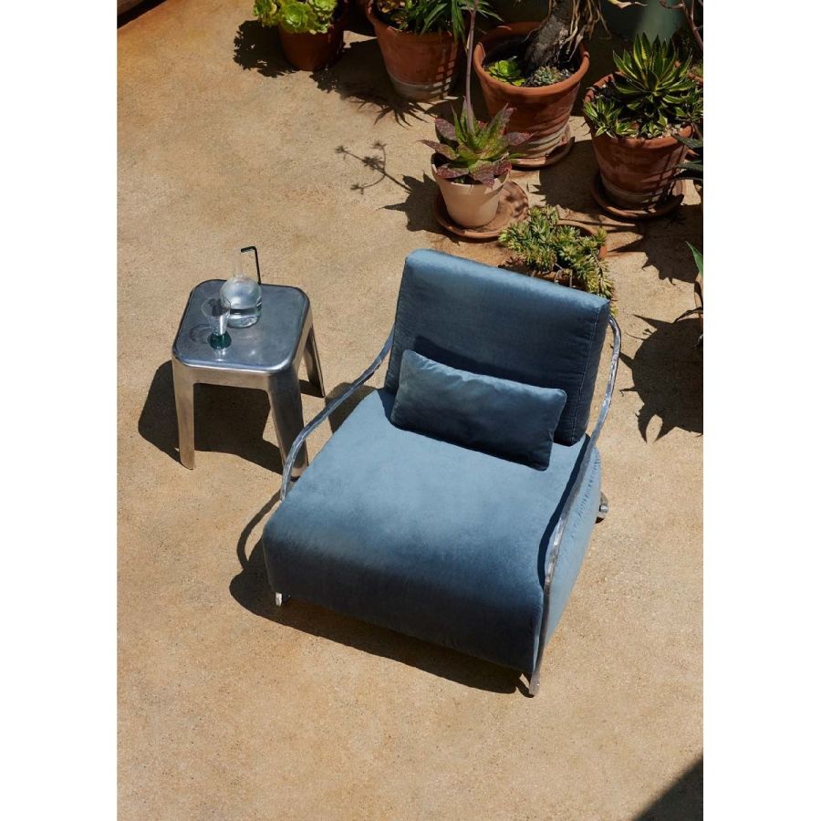 Moonlight Armchair, crafted in bronze or anticorodal aluminum, combines strength and lightness for outdoor use. Its slim frame embraces soft padding, while finishes—evolving patina in bronze or corrosion-resistant aluminum—reveal timeless elegance and sculptural beauty.