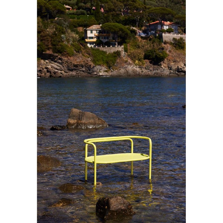 The Locus Solus Loveseat, reissued from Gae Aulenti’s 1964 design, is a playful icon of the Sixties. A tubular steel frame, painted in multiple colors, contrasts with handmade cushions in exclusive patterns. A seat for two that celebrates conviviality, elegance, and vintage charm outdoors or in.