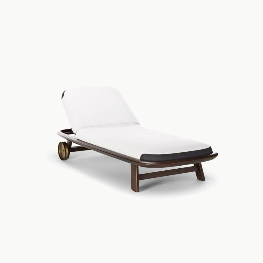 The Tellaro Sun Lounger combines poolside relaxation with refined elegance. Its Sapelli mahogany frame contrasts with leather and fabric details, while a reclining backrest ensures personalized comfort. Available in a double version or with optional wheels for added mobility and style.