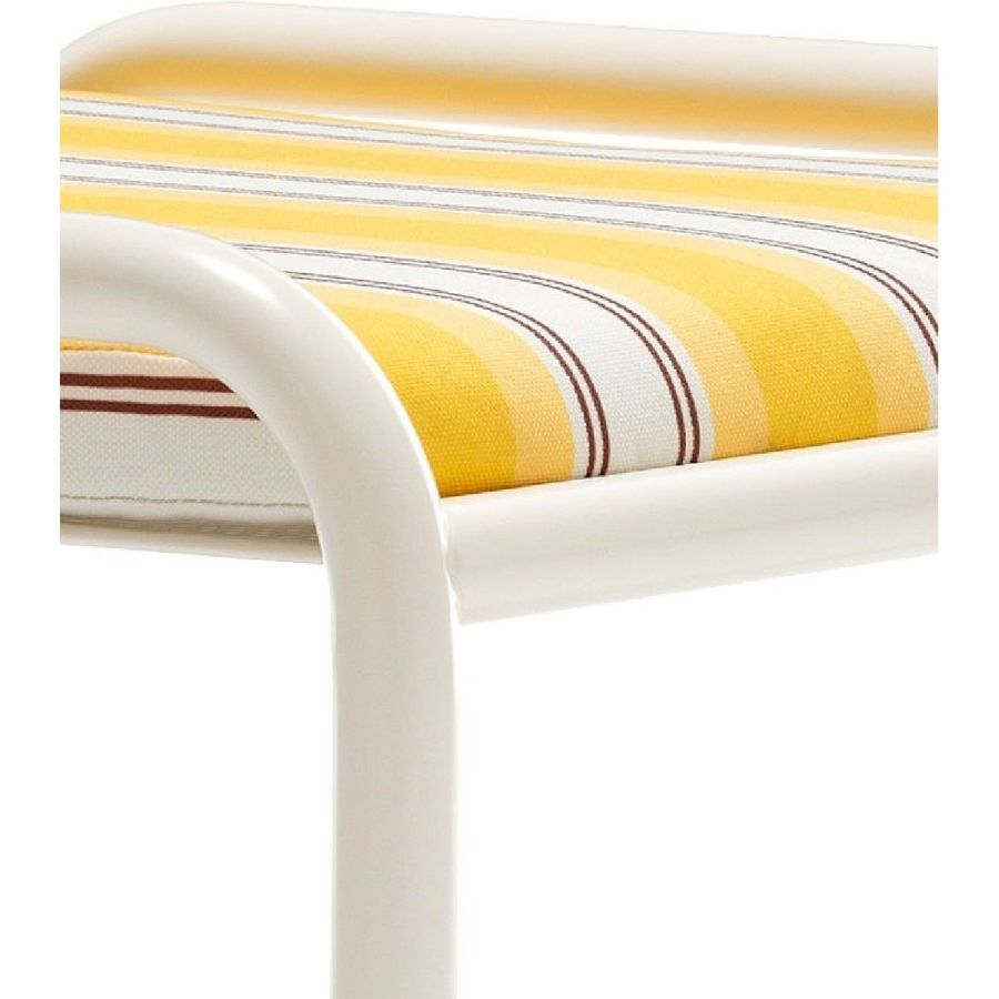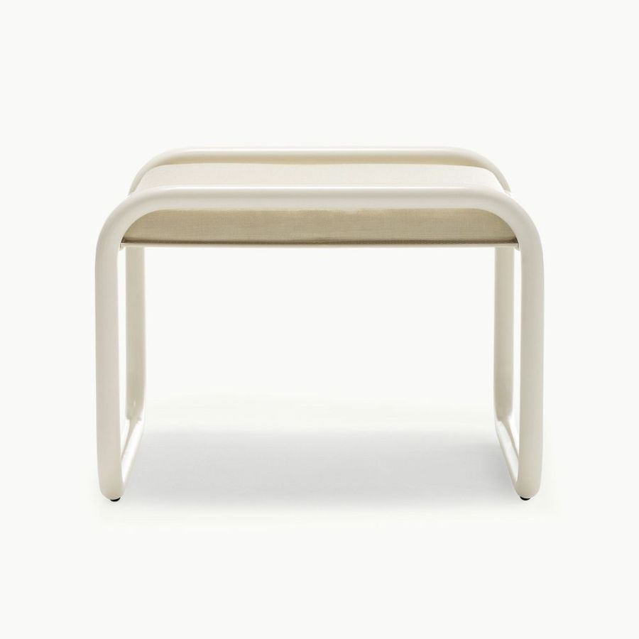 The Locus Solus Pouf, a special edition by Gae Aulenti and Jacquemus, transforms from cocktail table to seat with ease. Painted tubular steel frames a mesh base, enriched with striped or beige embroidered fabrics. A versatile icon merging Italian craft and Parisian boldness. Locus Solus Pouf reinvents vintage charm with playful versatility.