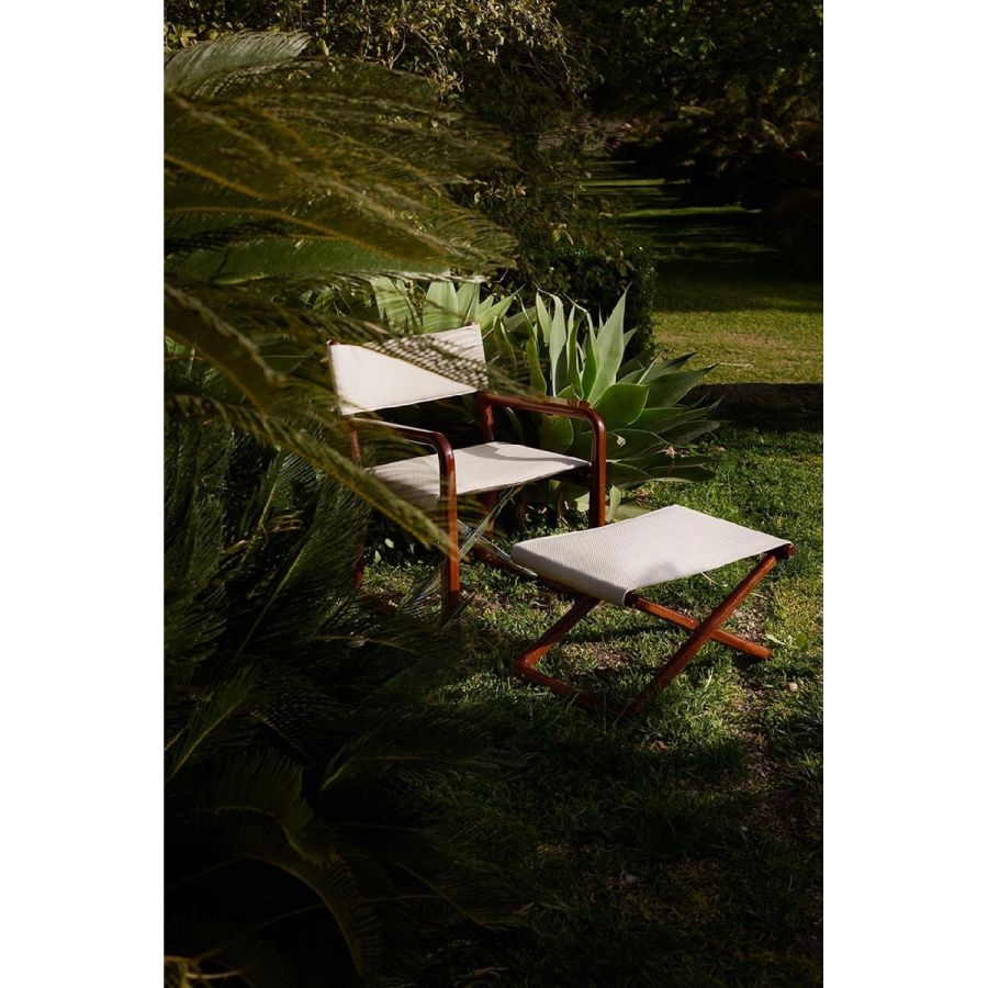 The LPIDC03 St. Moritz Foldable Stool enriches Loro Piana Interiors, The Delight Chairs by Exteta with a winter touch. In Sapelli mahogany and Loro Piana fabrics in cashmere and Zelander® wool with Storm System® 3L, it combines alpine elegance, waterproof innovation, and artisanal refinement.