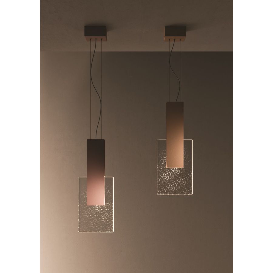 Amulette Art-pendellampa har en diffusor gjord av extra klart kristallglas med hamrade kanter med en målad borstad metall i guld, roséguld och antracit. Strömförsörjning - nätspänning för LED.