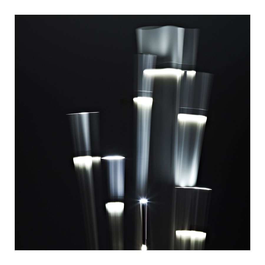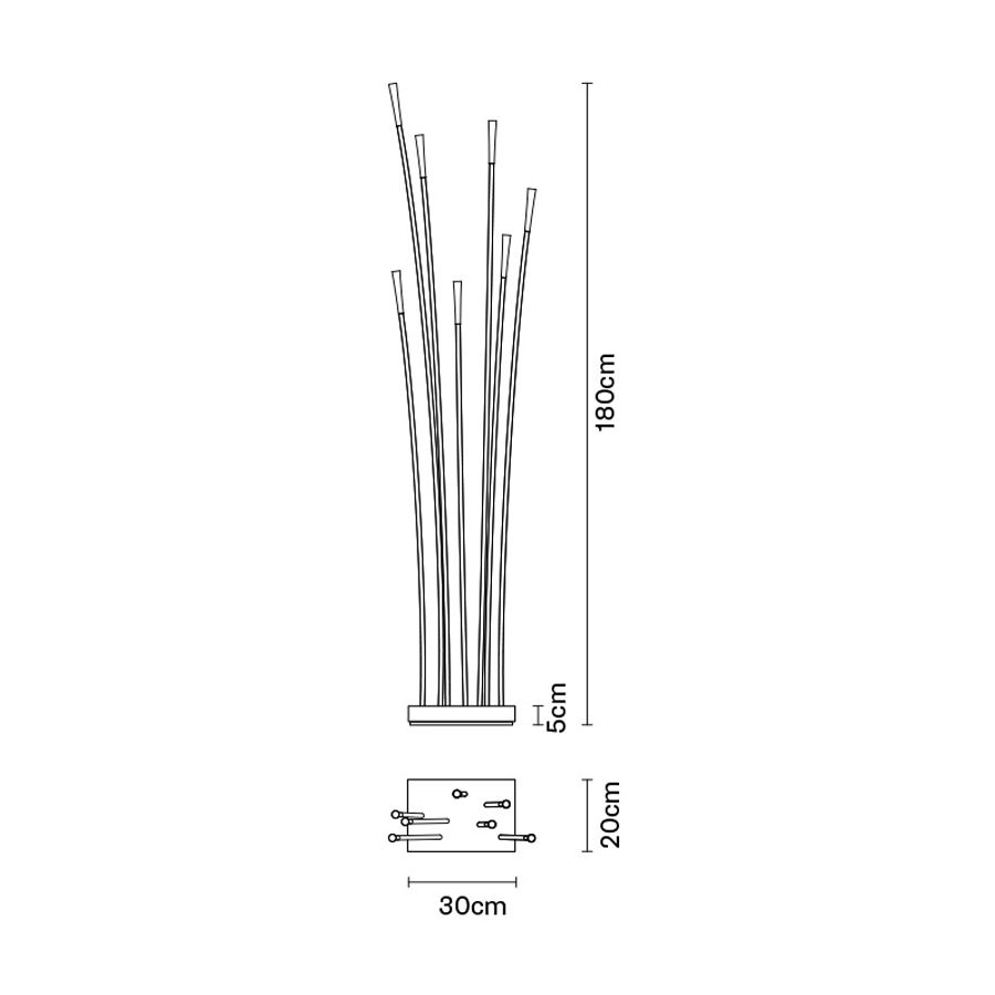 Golvlampa med stjälkar som är gjorda av vitt plastmaterial förstärkt med glasfiber. Den har en pulverlackerad metallisk grå bas och ett dubbelt LED-belysningssystem med dubbel strömbrytare. Huvudljusutsläppet kommer från den övre delen, medan orienteringsljuset ges av en svag ljuseffekt på armarna.