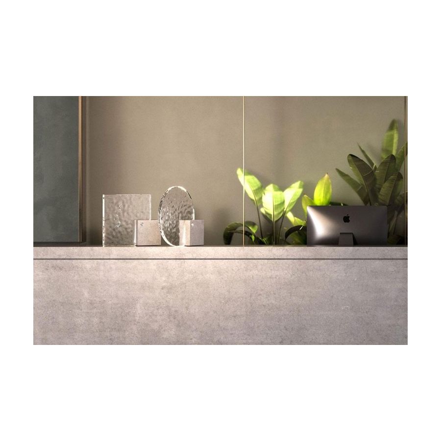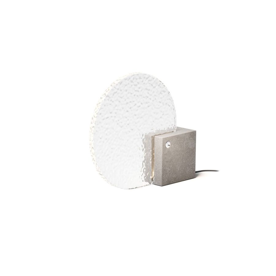 Plana-kollektionen består av två bordslampor. De består av en kvadrat, rektangel eller cirkel av gjutet glas hamrat på ena sidan, och en betongbas med ett sandblästrat PMMA-stift som fäster den mot glaset.