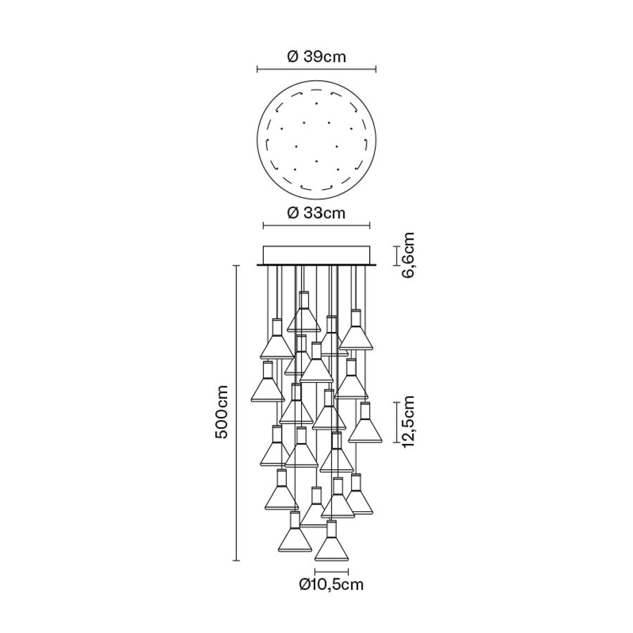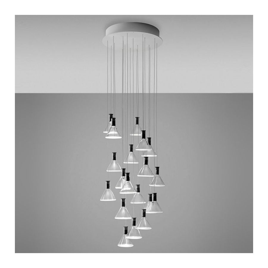 Multispot Polair hängande lampa har klara glasdiffusorer med frostad botten och ramar som finns i svart eller koppar. Kollektionen erbjuder ett brett utbud av storlekar och former av takrosett med armaturer enligt önskemål. Av denna anledning är lampan lämplig för alla miljöer och för skräddarsydda projekt.