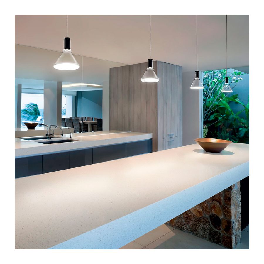 Multispot Polair pendellampa har klara glaskupor med frostat underrede och ramarna finns i svart eller koppar. Kollektionen erbjuder ett brett utbud av storlekar och former på takkåporna med armaturer enligt önskemål. Av denna anledning är lampan lämplig för alla miljöer och för kundanpassade projekt.