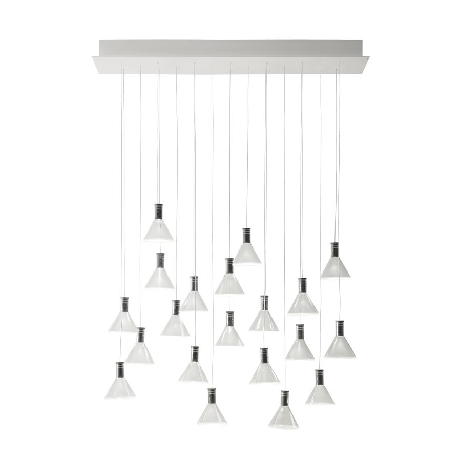 Multispot Polair-hänglampan har klara glasdiffusorer med frostad botten och finns med ramar i svart eller koppar. Kollektionen erbjuder ett brett urval av storlekar och former på takrosetter med armaturer enligt önskemål. Av denna anledning är lampan lämplig för alla miljöer och för skräddarsydda projekt.