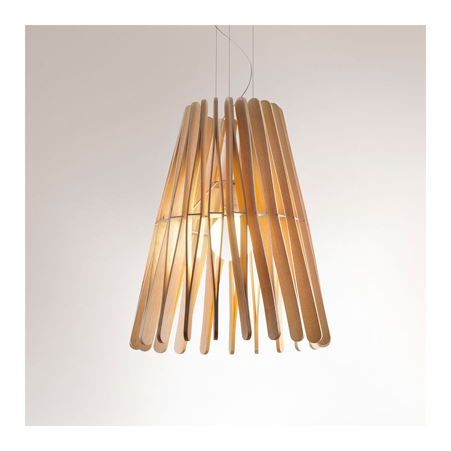Stick Cone pendellampa är ett mycket originellt föremål för kreativa och ungdomliga miljöer, dess naturliga material gör lampan uppmärksam på hållbarhet och ekologi. Ljuset som passerar genom trälamellerna skapar slående effekter på omgivningen.