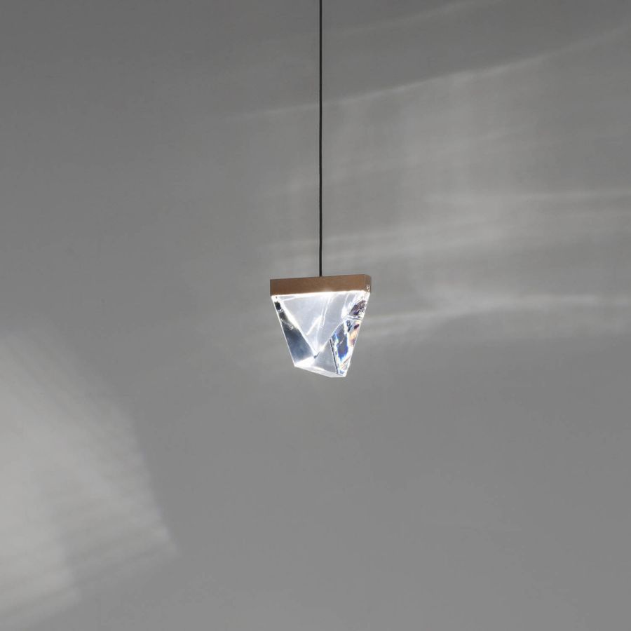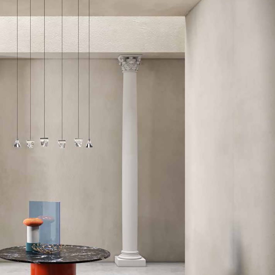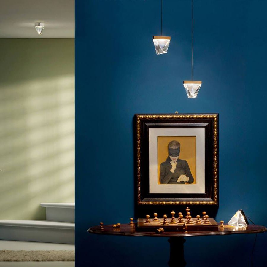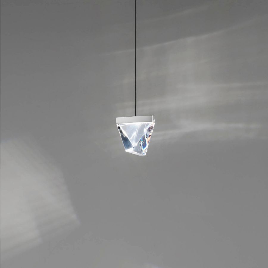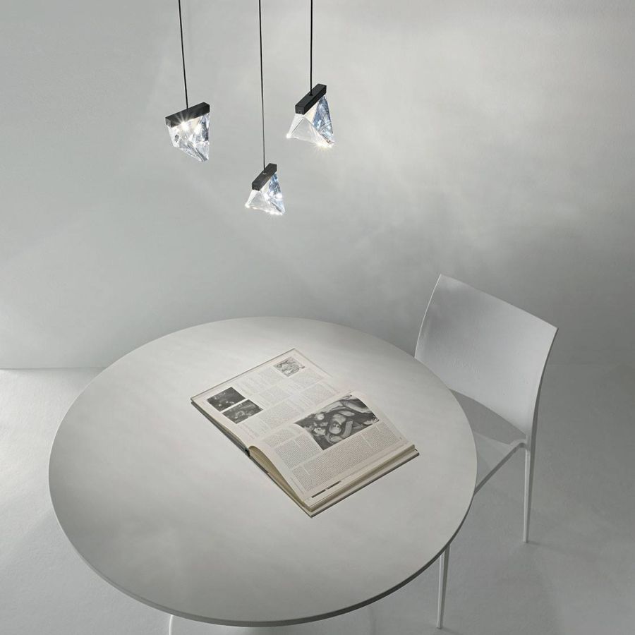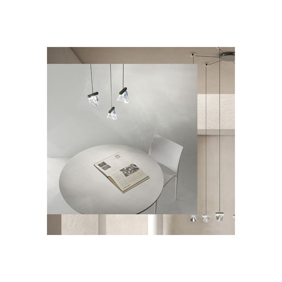 Det mångsidiga och anpassningsbara Tripla-systemet erbjuder möjligheten att berika och ge unikhet åt stora och bostadsutrymmen. Lampan är helt anpassningsbar och strukturen finns i tre ytbehandlingar: polerat aluminium, antracit och brons. Diffusorn är i kristallglas, medan takrosetterna finns i två storlekar och i de tre ovan angivna ytbehandlingarna. Lampan drivs med nätström för LED eftersom den inkluderar en dimbar driver.