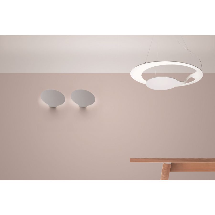 Den geometriska formen definieras inte så mycket av den fulla delen utan av det centrala tomrummet, skapat av laserskärningen av den tunna skivan som ger Glu dess särskilda form och ljuseffekt, vilket gör den lätt och balanserad. Det indirekta ljuset som produceras betonar ytterligare kontrasten mellan tomhet och fyllnad och skapar intressanta ljus- och skuggeffekter.