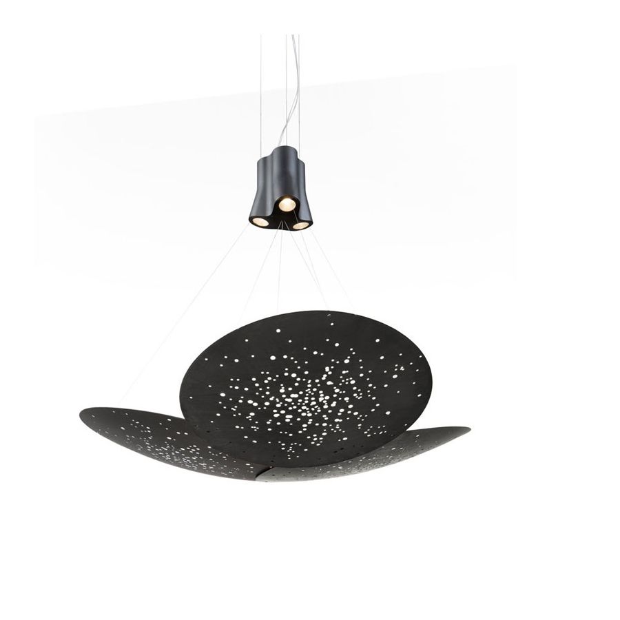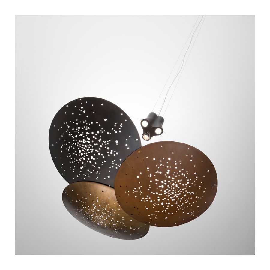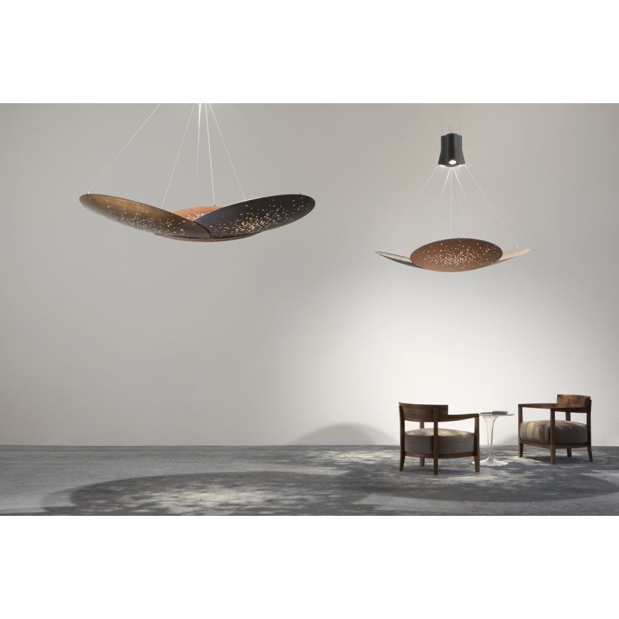 Hänglampa med svart aluminiumstruktur och lins i järn. Linsen genomgår en oxideringsprocess inducerad av låga och följs av borstning, svampning, polering och slipning.