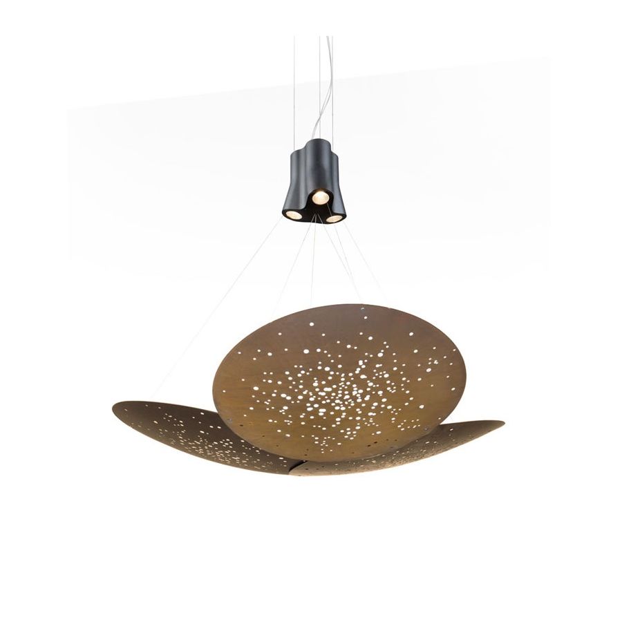 Hänglampan Lens har en metalldiffusor i tre olika ädla ytbehandlingar. Denna lampa kan passa i olika miljöer tack vare sina två olika storlekar. Den mindre versionen med en enda spotlight kan belysa bostadsutrymmen, medan den större versionen med tre spotlights lämpar sig för att möblera och dekorera stora ytor som restauranger, barer och lobbyn.