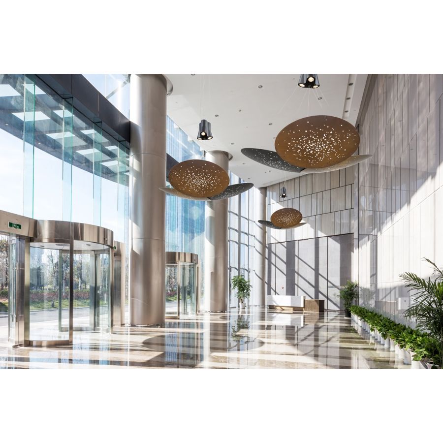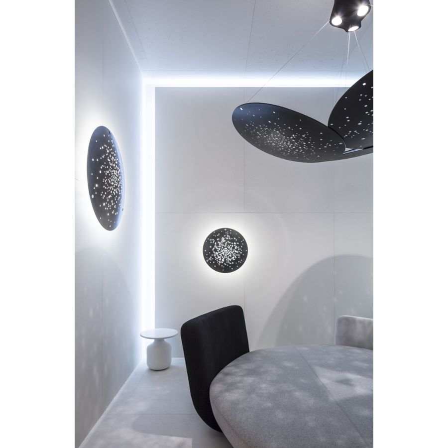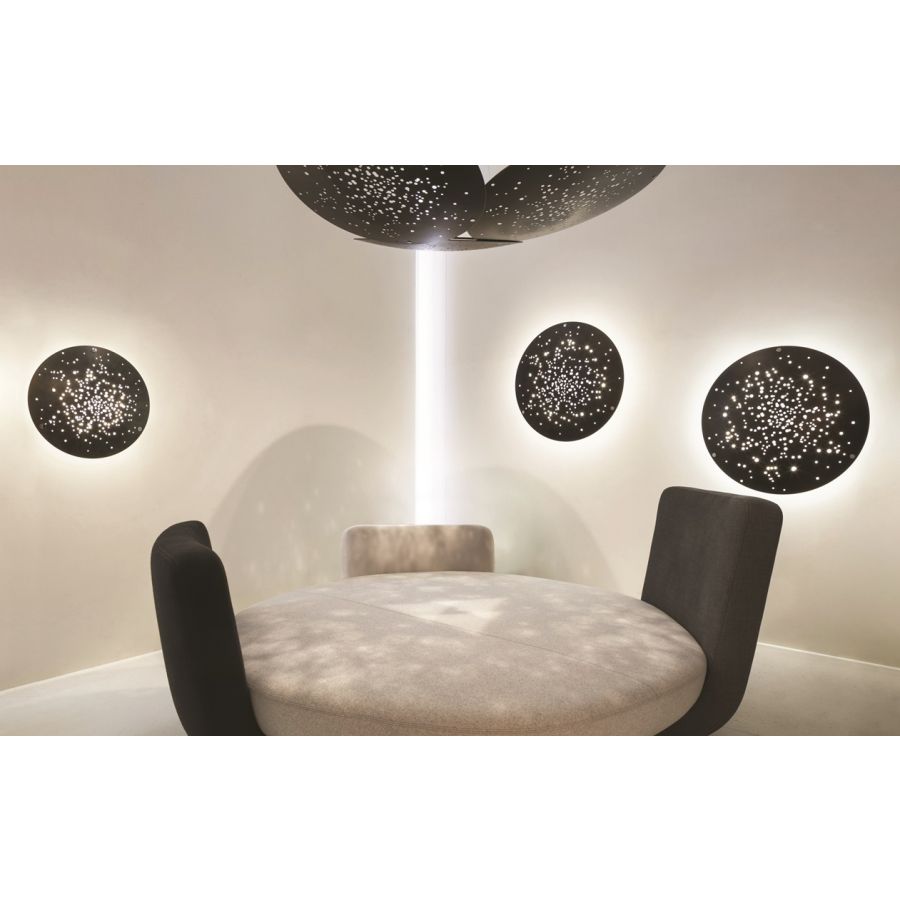 Inspirerad av en lins som koncentrerar och avleder solljus, fångar Lens ljuset, filtrerar det och släpper sedan ut det på nytt i omgivningen. Den oregelbundna linsytans dekoration gör att ljuset sprids och skapar ljus- och skuggeffekter på elementen nedanför. Omgivningen, träffad av dessa nya nyanser, förenas med ljuskällan och skapar en behaglig dekorativ effekt. Monteringarna med tre linsgrupper anspelar på det kosmiska och det jordiska, där ljuset förenar dessa två sfärer.