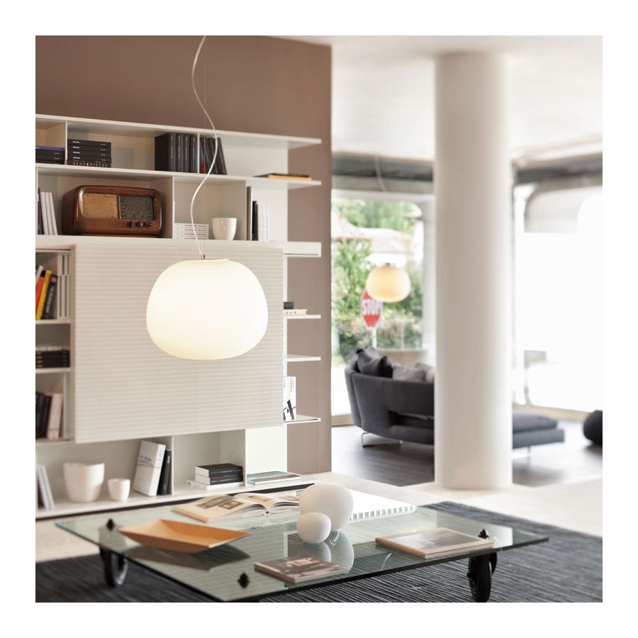 Lumi Mochi pendellampa finns i fyra storlekar och består av diffusorer i vitt munblåst glas med en mycket särskild form. Denna lampa ger ett mycket effektivt och jämnt ljus i hela rummet. Den är idealisk för köket, vardagsrummet eller salongen i ett privat hem men också för restauranger, barer och hotell.