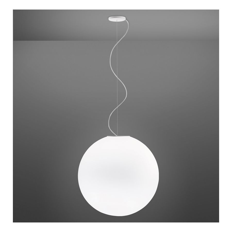 Lumi Sfera-pendantlampan har en universell form och är därför lämplig för alla privata och offentliga miljöer. Den finns med sex storlekar på diffusorn i vitt munblåst glas med möjlighet att använda energieffektiva halogen- eller integrerade LED-lampor. Sammansättningar av hängande lampor i olika storlekar är ganska spektakulära på offentliga platser.