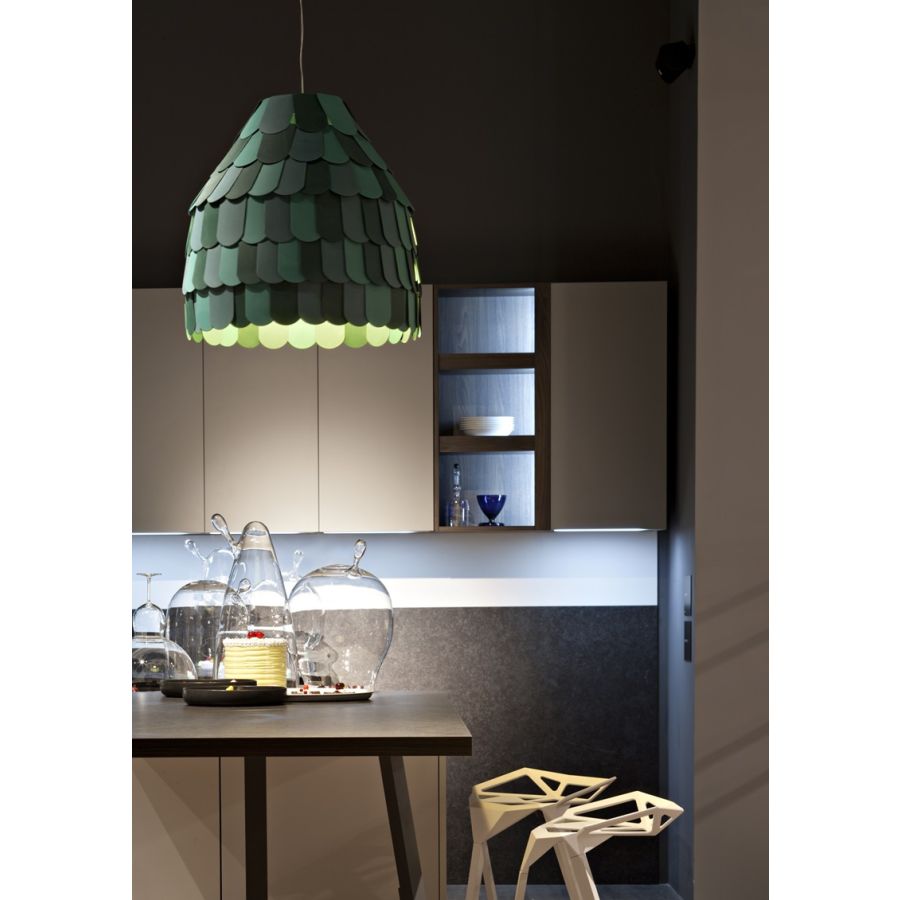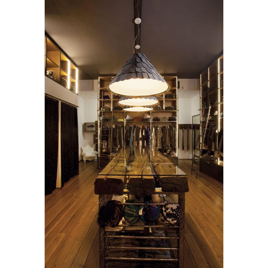 Roofer-hänglampan har en mycket förfinad form täckt av många gummiplattor i olika färger (vit, grön, brun och grå). Den har en mycket lekfull stil, därför rekommenderas den för att karaktärisera miljöer som behöver förbättra sin stil och design.