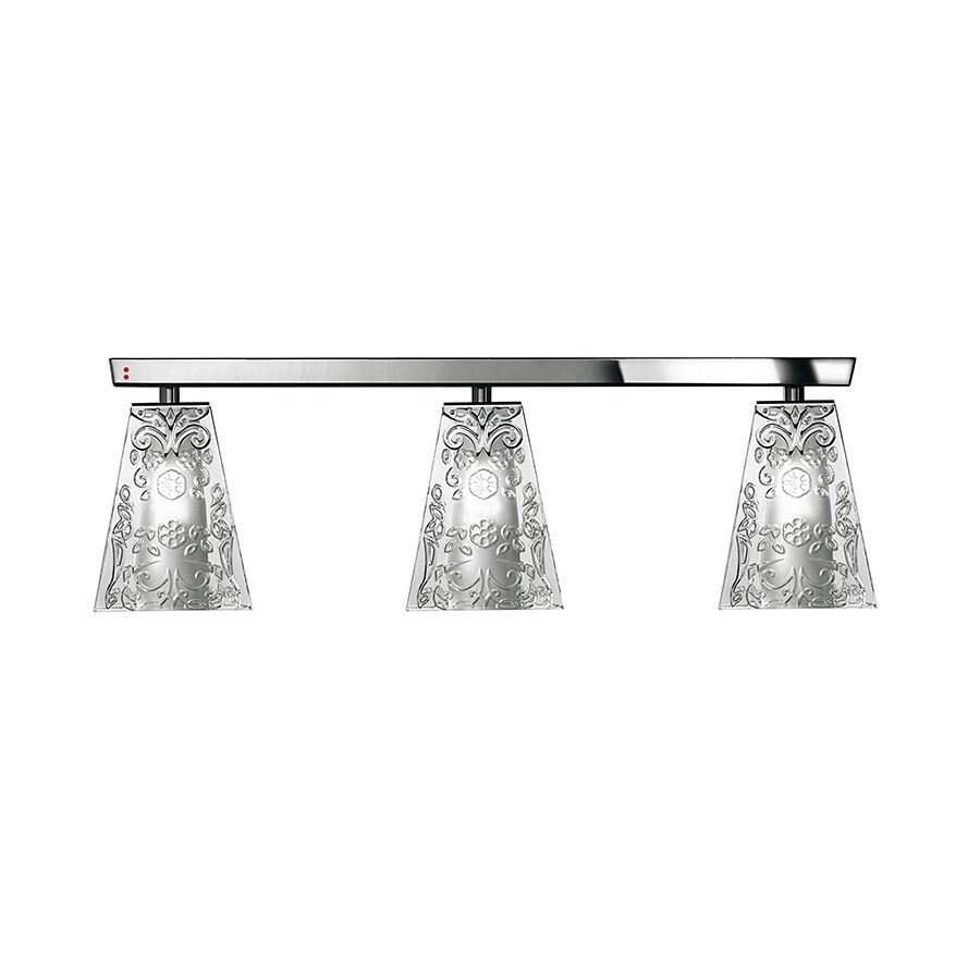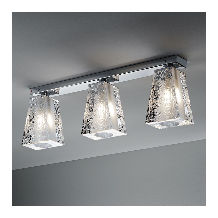 Taklampan Vicky finns tillgänglig med en eller tre lampfästen. Diffusorn är i dekorerat kristall och stommen i polerad krom. Lampan passar både moderna men också klassiska miljöer tack vare sin universella och sofistikerade design. Den är utmärkt i hemmets vardagsrum, i badrummet på ett hotell eller i en butik.