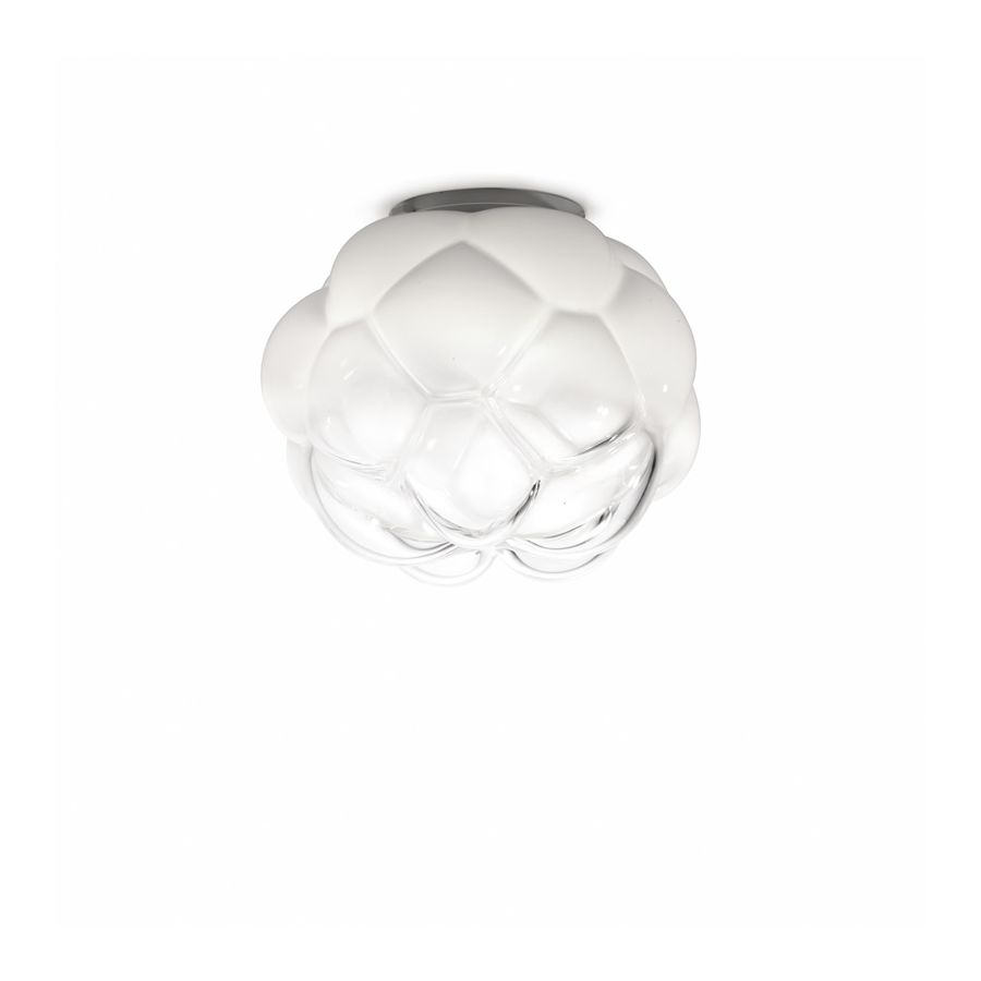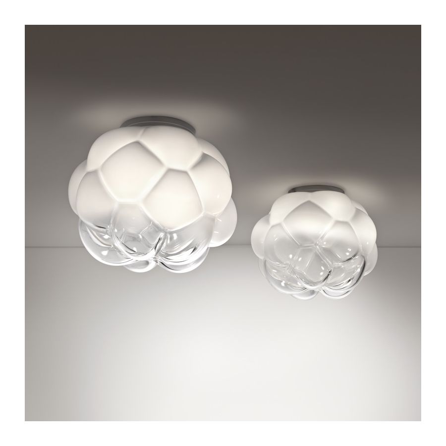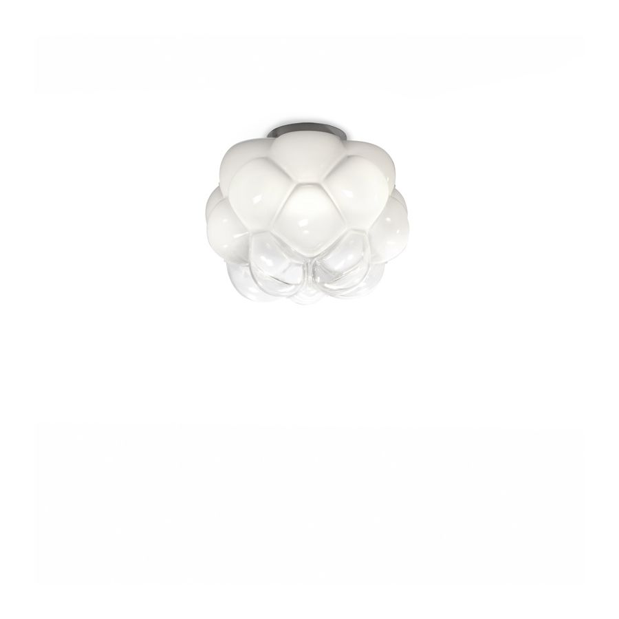 Taklampan Cloudy är mycket originell tack vare den särskilda formen på diffusorn i vitt och genomskinligt munblåst glas. Den är perfekt lämpad för att belysa vilket rum som helst i hemmet, köket vardagsrummet men också sovrummen. I en professionell studio ger den en touch av sofistikering och kreativitet.