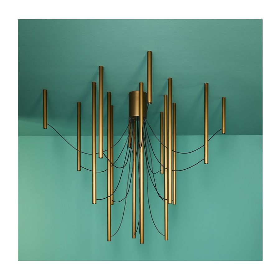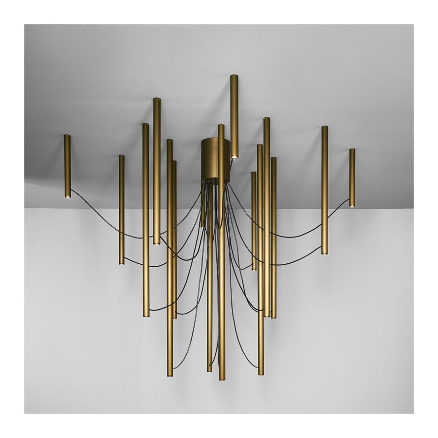 Ari är ett modulärt belysningssystem som kan anpassa sig till små och stora utrymmen, till olika stilar och användningsbehov. Från den strama enkelheten i versionen med ett enda ljuselement, projektets matris, kan det kombineras upp till versionen med 16 element. Elementen, essentiella och rena, i olika längder, kan installeras i taket fritt eller följande precisa geometriska mönster runt den centrala rosetten. Detta är Ari:s högsta uttryck: få grafiska tecken som tolkar de klassiska ljuskronornas geometrier i en samtida och minimalistisk ton, och fyller och dekorerar rummet med lätta och eteriska volymer. Ett nytt system som förbinder dåtid och nutid. Ett formellt och rent språk som översätter och syntetiserar traditionella figurer.