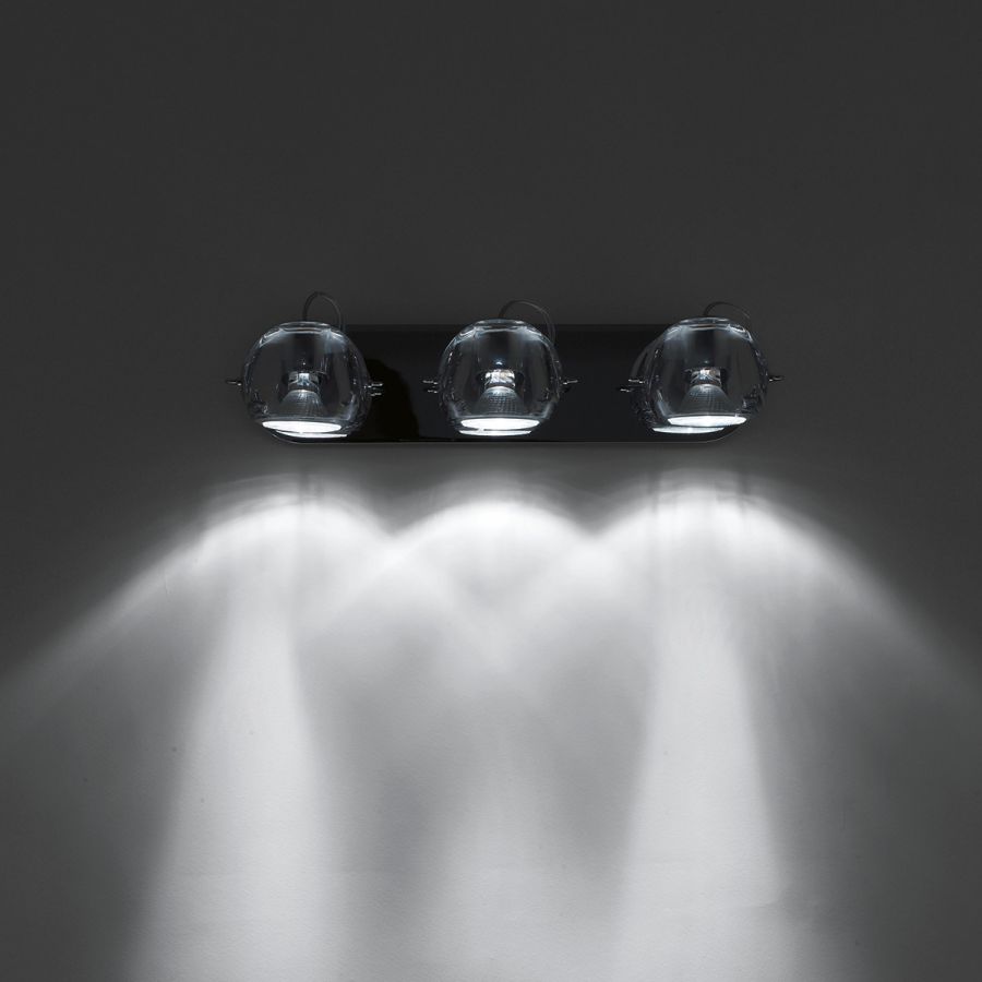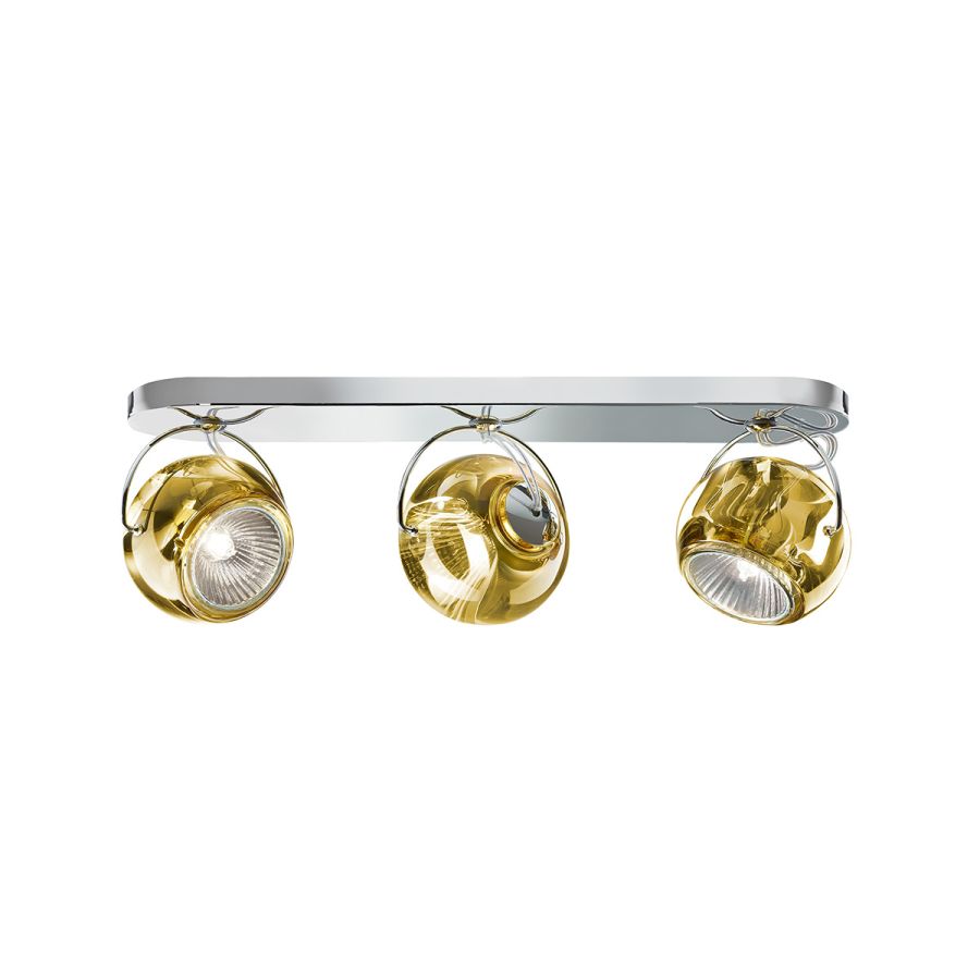 De sfäriska diffusorerna roterar till vilken position som helst och finns i olika storlekar och material: transparent eller målad kristall, polerad krom eller blankt vitt munblåst glas. Alla metalliska strukturer är i polerad krom.