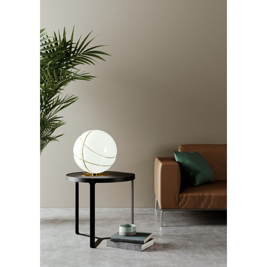 Bordslampa med diffusor i blankt vitt munblåst glas, bruniserade ringar, vit fot och kupa.
