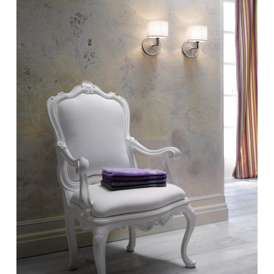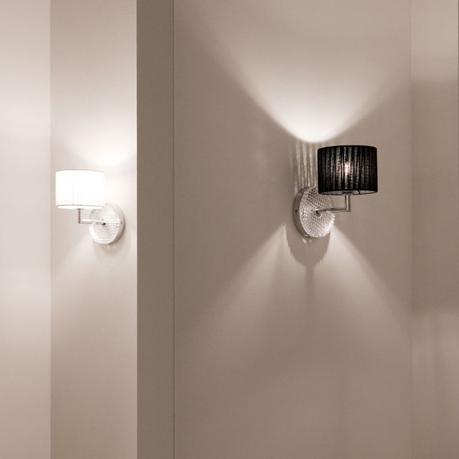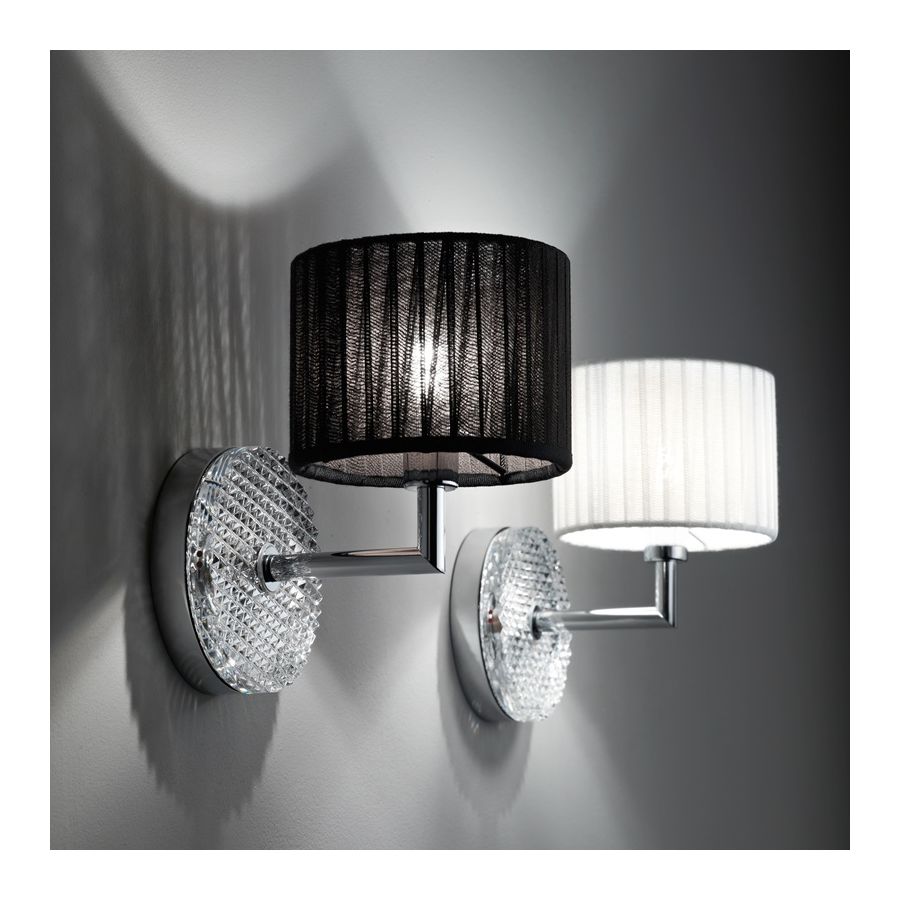 Vägglampa med diffusor i kristallglas, handslipad. Polerade kromdetaljer. Svart & Vitt canetè-organza lampskärm.