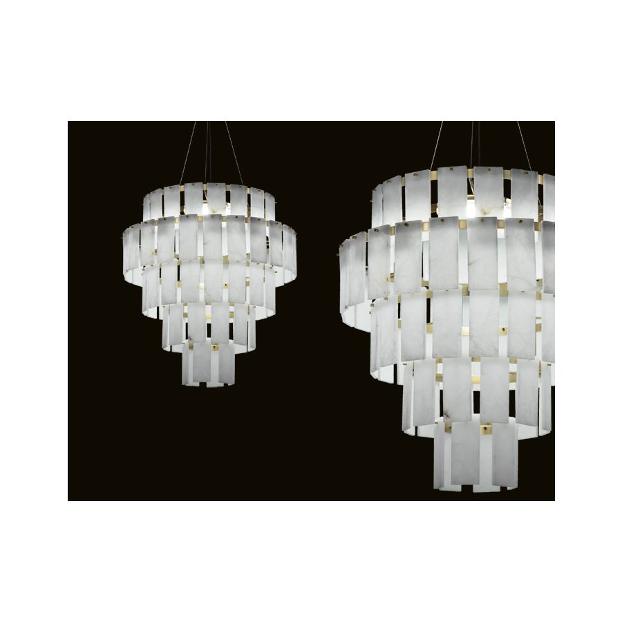 Denna uppsättning pendlar framkallar storslagenheten hos antika imperier genom att kombinera mässingsringar och vita alabaster- eller ekträplattor. Varje pjäs är omsorgsfullt tillverkad för att åkalla känslan av prakt och ädelhet som förknippas med svunna epoker.