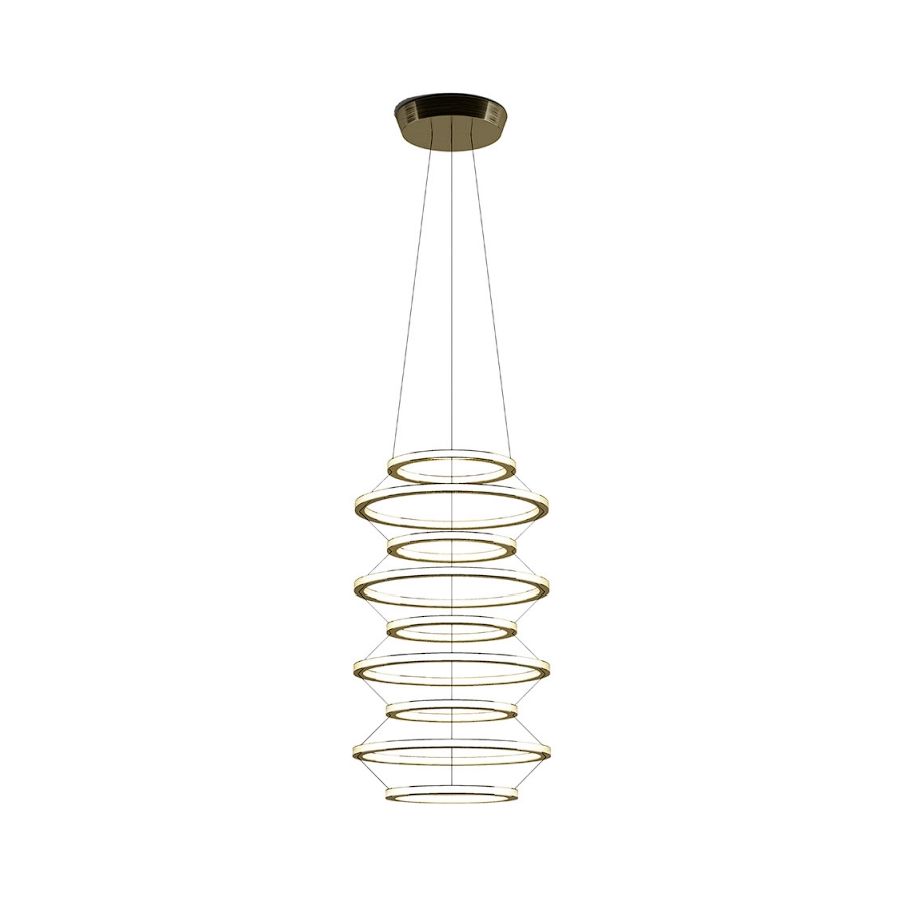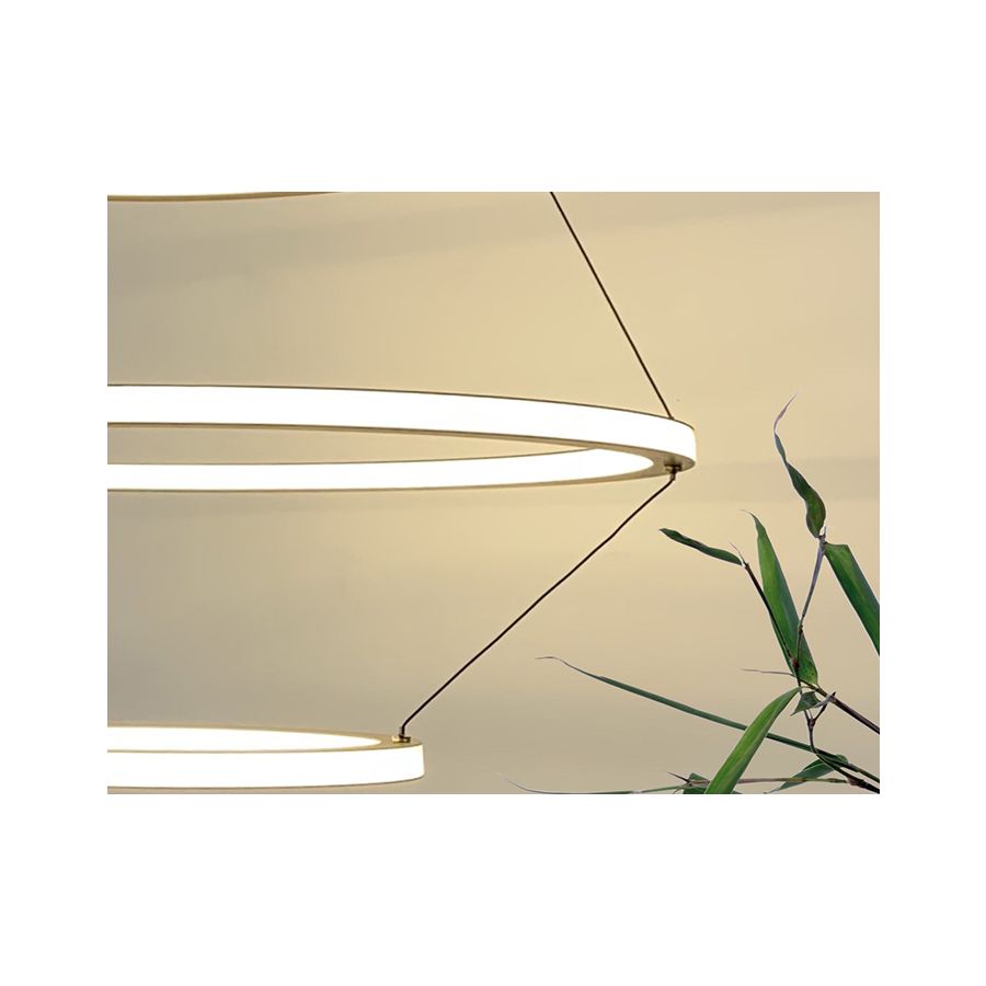 Uppsättningen av pendellampor är ett verk bestående av metallringar, prydda med detaljer i mässing. Varje ring innehåller en opalin akryldiffusor både på utsidan och insidan, vilket möjliggör en jämn spridning av en varm, integrerad LED-ljuskälla. Denna omsorgsfulla sammansättning erbjuder enastående mångsidighet: genom att kombinera de fem olika ringdiametrarna visas ett brett spektrum av möjliga volymer och former.