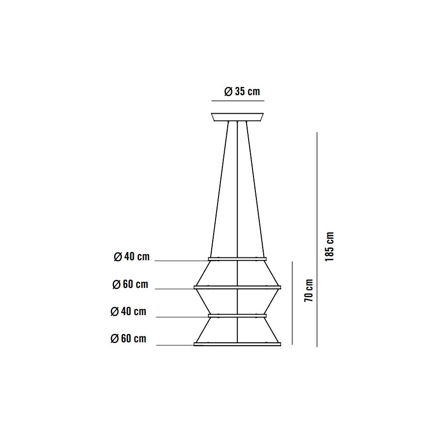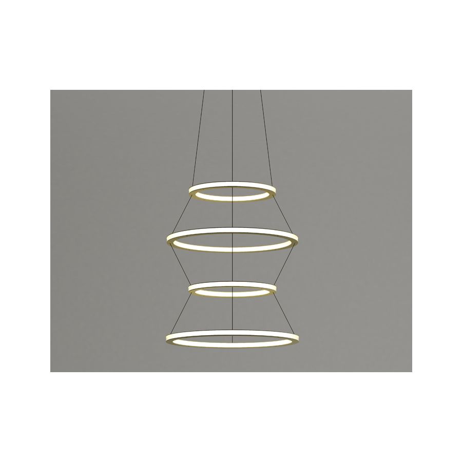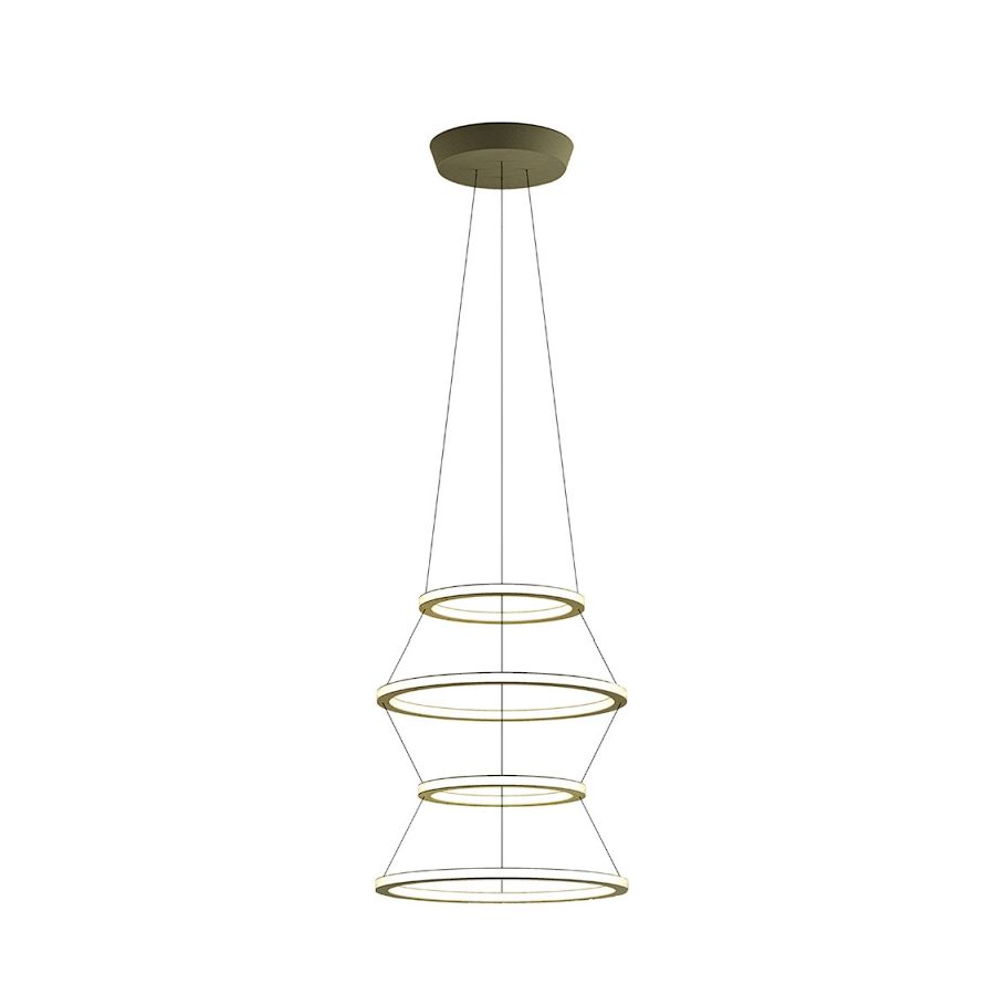 Uppsättningen pendelarmaturer är ett verk sammansatt av metallringar, prydda med mässingsdetaljer. Varje ring innehåller en opalin akryldiffusor både på utsidan och insidan, vilket möjliggör en jämn spridning av en varm, integrerad LED-ljuskälla. Denna noggranna sammansättning erbjuder enastående mångsidighet: genom att kombinera de fem olika ringdiametrarna visas ett brett spektrum av möjliga volymer och former.