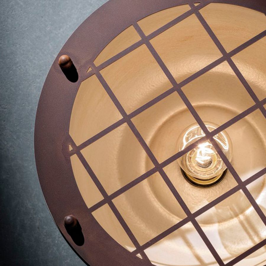 Industriell takarmatur från Ferroluce, kombinerar vintage- och industriella designstilar. Exklusiv belysning som förfinar ett rums stil och atmosfär.