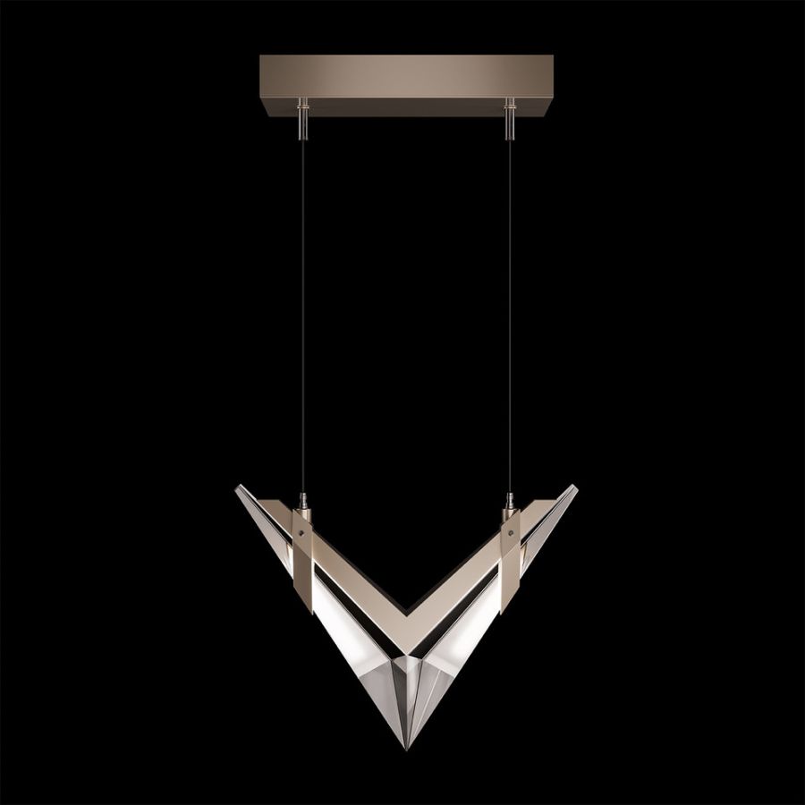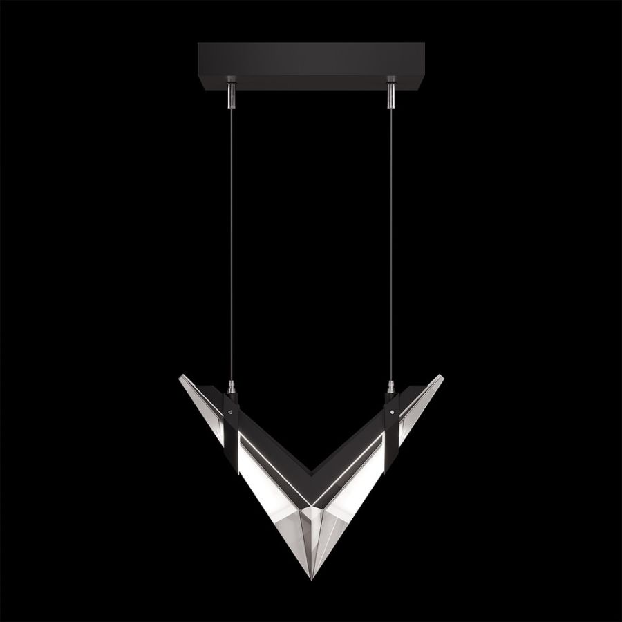 Inspired by the bold geometry of chevron shapes and the sleek lines of modern aircraft, Blade brings a sense of motion and precision to lighting design and merges sleek design with modern functionality. Pendant features cut crystal and integrated LEDs in Standard Black Iron or Champagne finish. Dark Walnut stained wood featured on select items adding warmth to the metal forms.