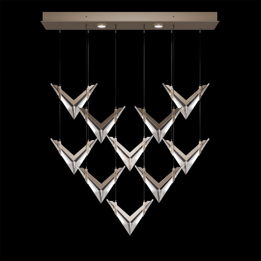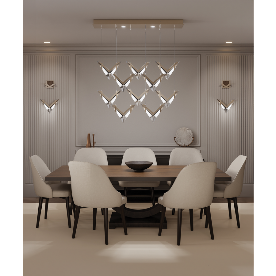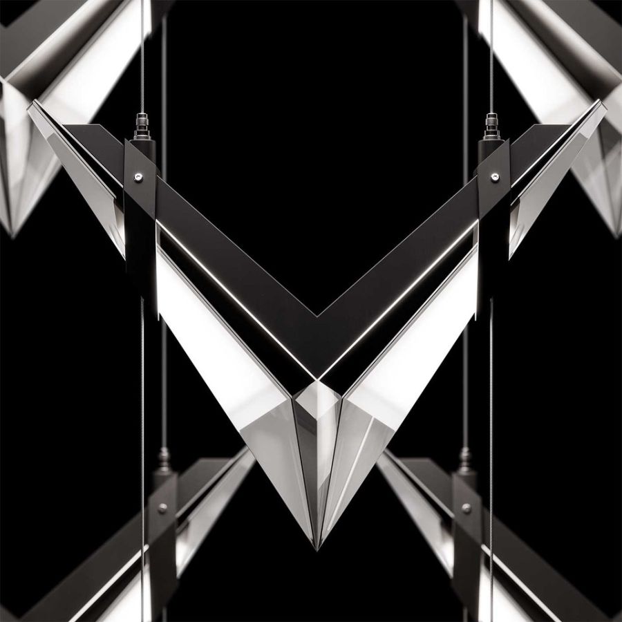 Inspired by the bold geometry of chevron shapes and the sleek lines of modern aircraft, Blade brings a sense of motion and precision to lighting design and merges sleek design with modern functionality. Pendant features cut crystal and integrated LEDs in Standard Black Iron or Champagne finish. Dark Walnut stained wood featured on select items adding warmth to the metal forms.