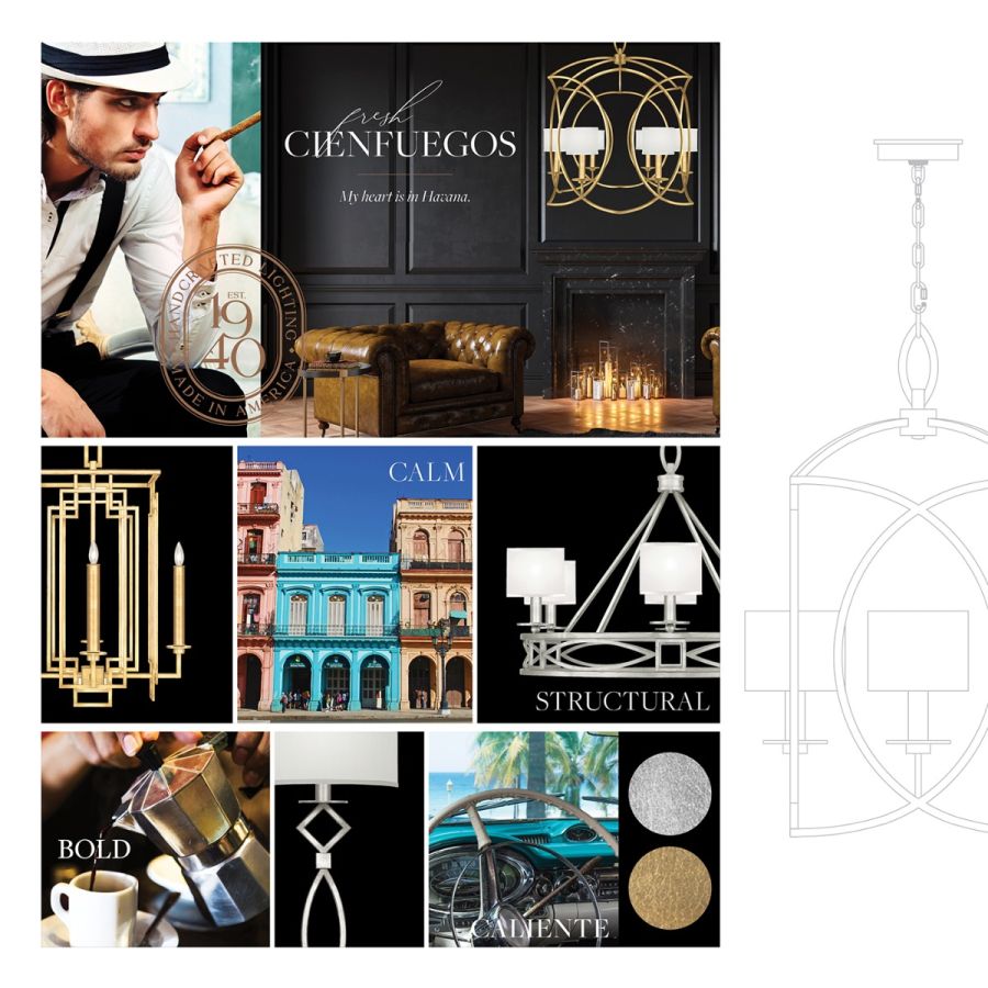 The exquisite seaside city of Cienfuegos on the southern coast of Cuba was built by French émigrés two centuries ago, and is known as “The Pearl of the South.” The 1920s were a unique transitional period in architecture and design in Cienfuegos, combining the old and the new. Metalworking innovations flourished among the artisans. This period inspired our eclectic collection. As part of our Refresh program, our Cienfuegos collection has been given a contemporary look with our bright “fresh” standard silver leaf or standard gold leaf finish with matching candlesticks, as shown to the right. Chandelier and sconce shades have also been updated for a coordinating modern look. Our classic Cienfuegos in antique bronze, weathered greige, and gold with textured natural greige fabric shades are also featured.