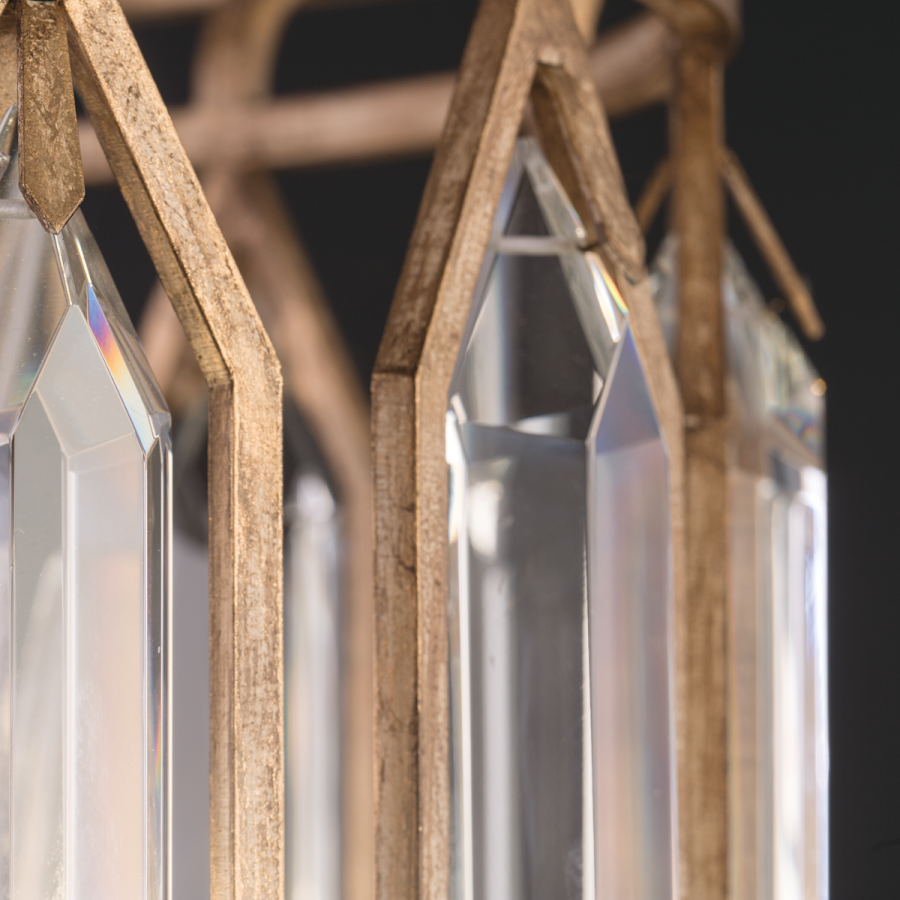 Westminster is thoughtfully designed to be both boldly dramatic and quietly subtle. Double-faced beveled crystals exquisitely float openly in individual metal frames that conform to the crystal shapes but without touching them. The lanterns, chandeliers, pendants, and sconces are offered in a choice of warmly washed pale antique gold or softly weathered English brown iron patina with vestiges of silver. Both aged finishes lend a casual elegance to today’s interior styles.