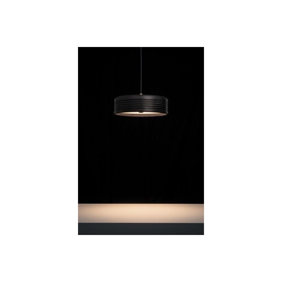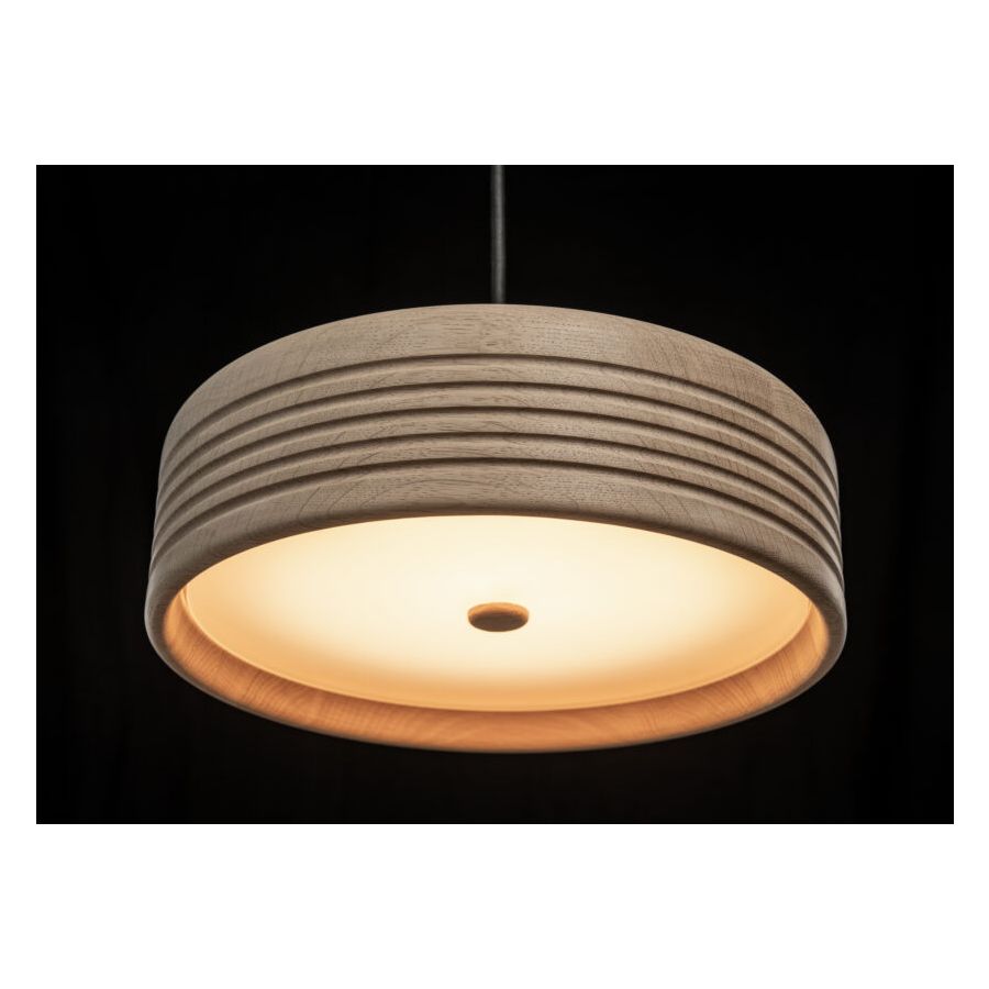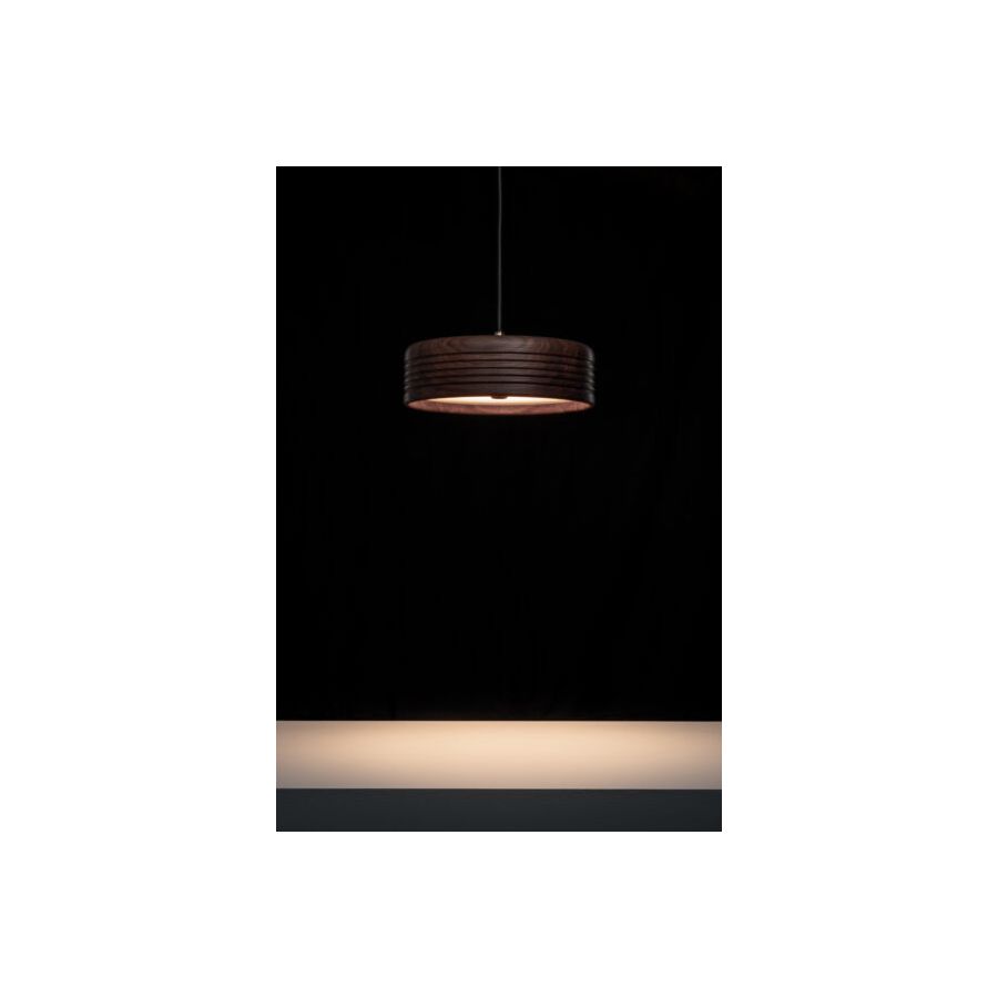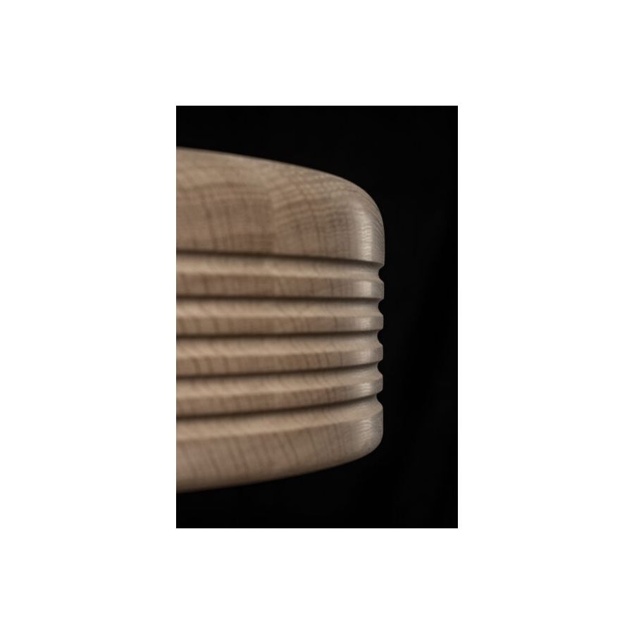 WOOD is a natural suspension lamp spreading warm and cozy vibes. The minimalistic cylindrical shape is enriched by symmetric ripples, highlighting the artisan turning process. Available in oak (raw), American walnut (oiled), and ash (stained black), WOOD is a perfect blend of Scandinavian clarity and organic charm. Defined by the individual grain and annual rings, each piece is as unique as a fingerprint. And the ecological footprint is close to zero: Formagenda plants a tree for each WOOD which is sold.