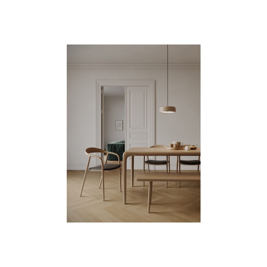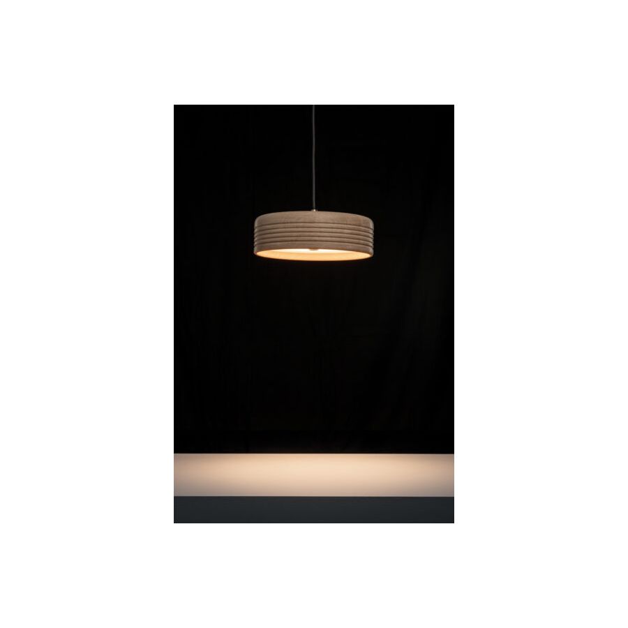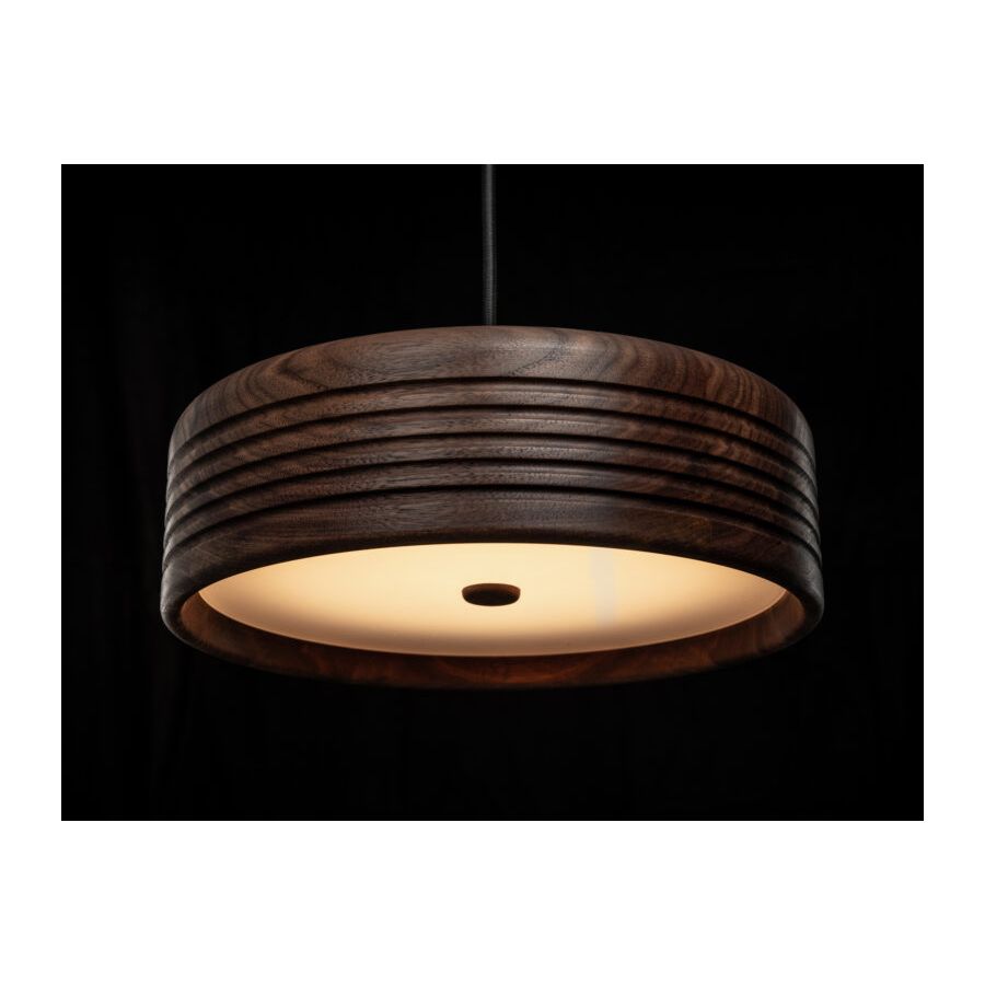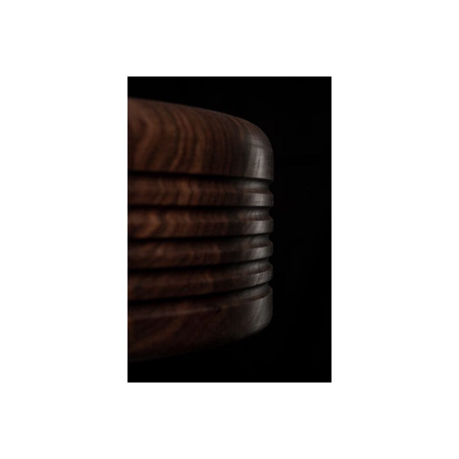 WOOD is a natural suspension lamp spreading warm and cozy vibes. The minimalistic cylindrical shape is enriched by symmetric ripples, highlighting the artisan turning process. Available in oak (raw), American walnut (oiled), and ash (stained black), WOOD is a perfect blend of Scandinavian clarity and organic charm. Defined by the individual grain and annual rings, each piece is as unique as a fingerprint. And the ecological footprint is close to zero: Formagenda plants a tree for each WOOD which is sold.